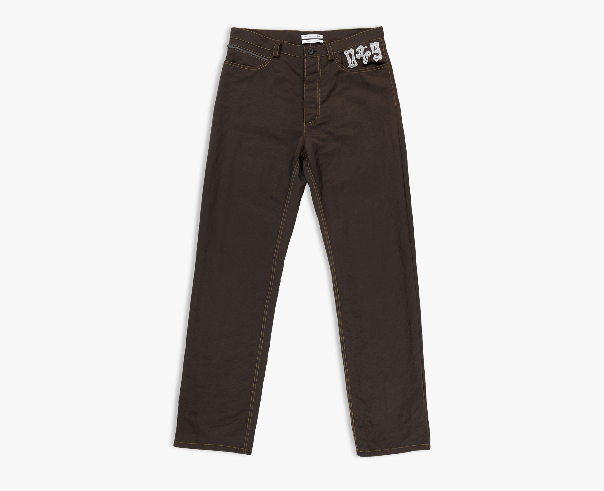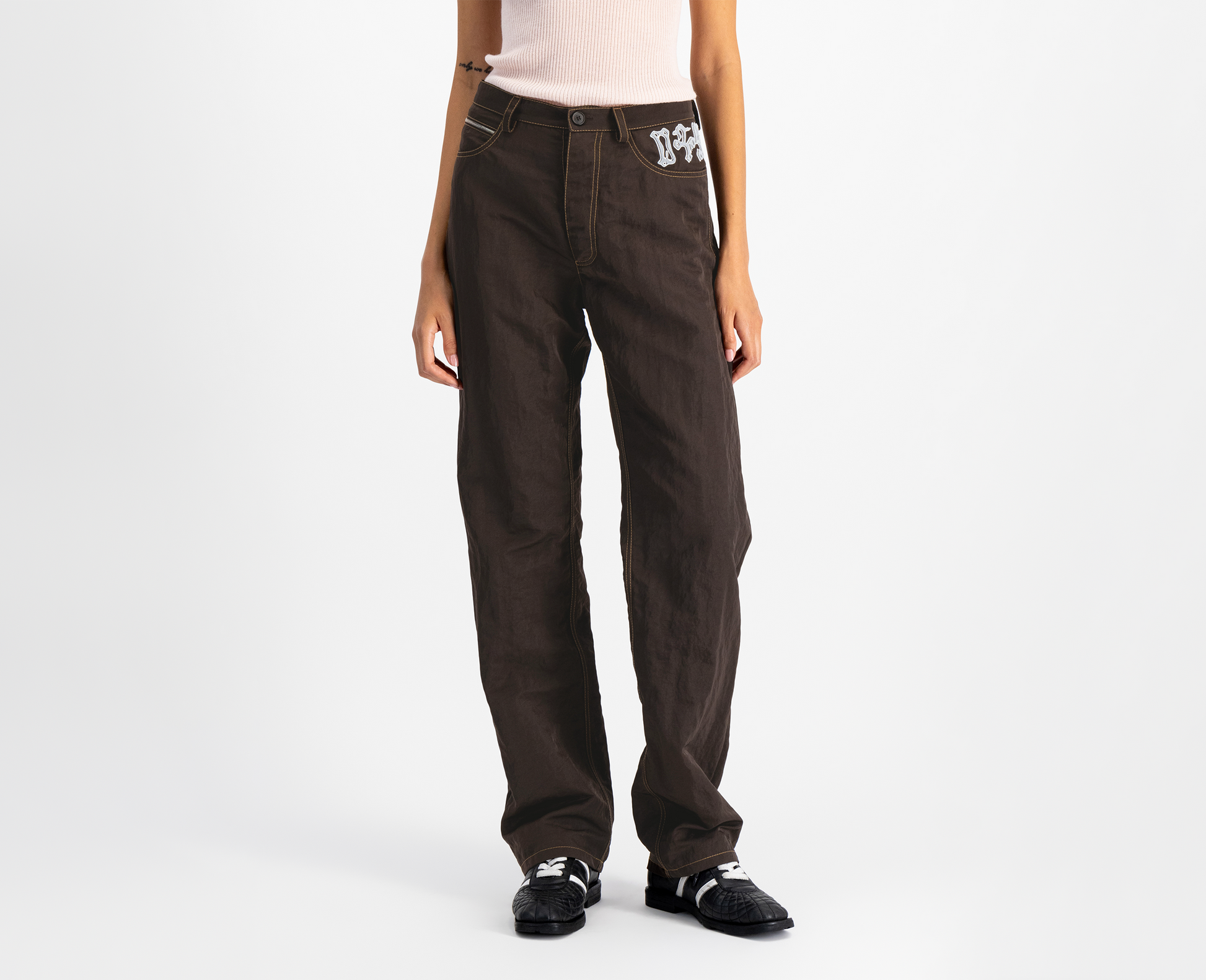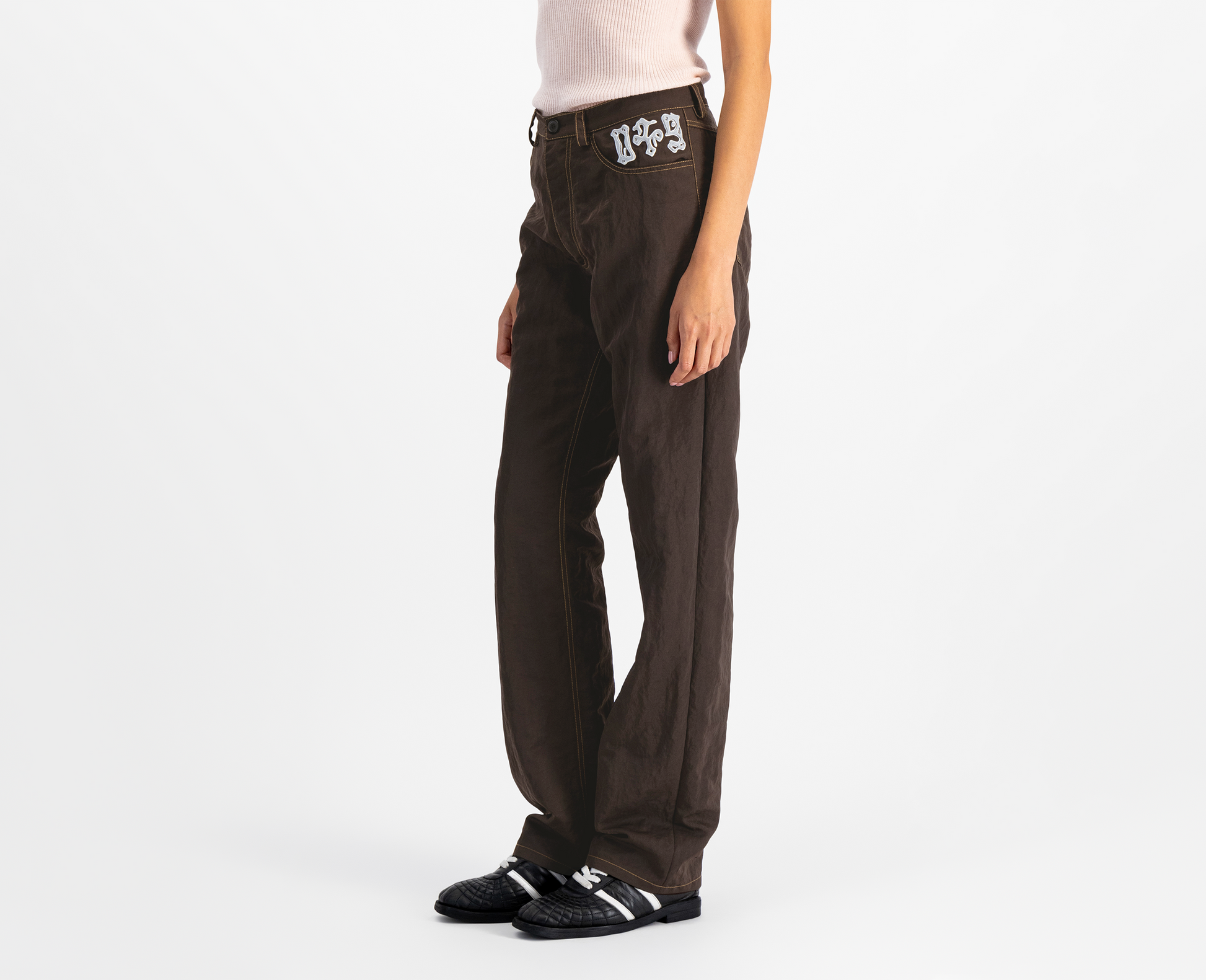 Straight cut nylon jeans with logo embroidery. Made in Switzerland.