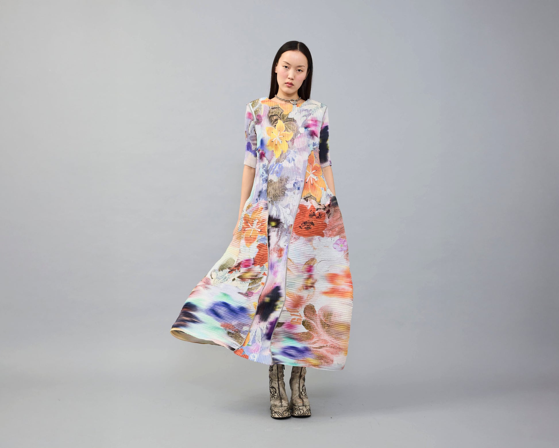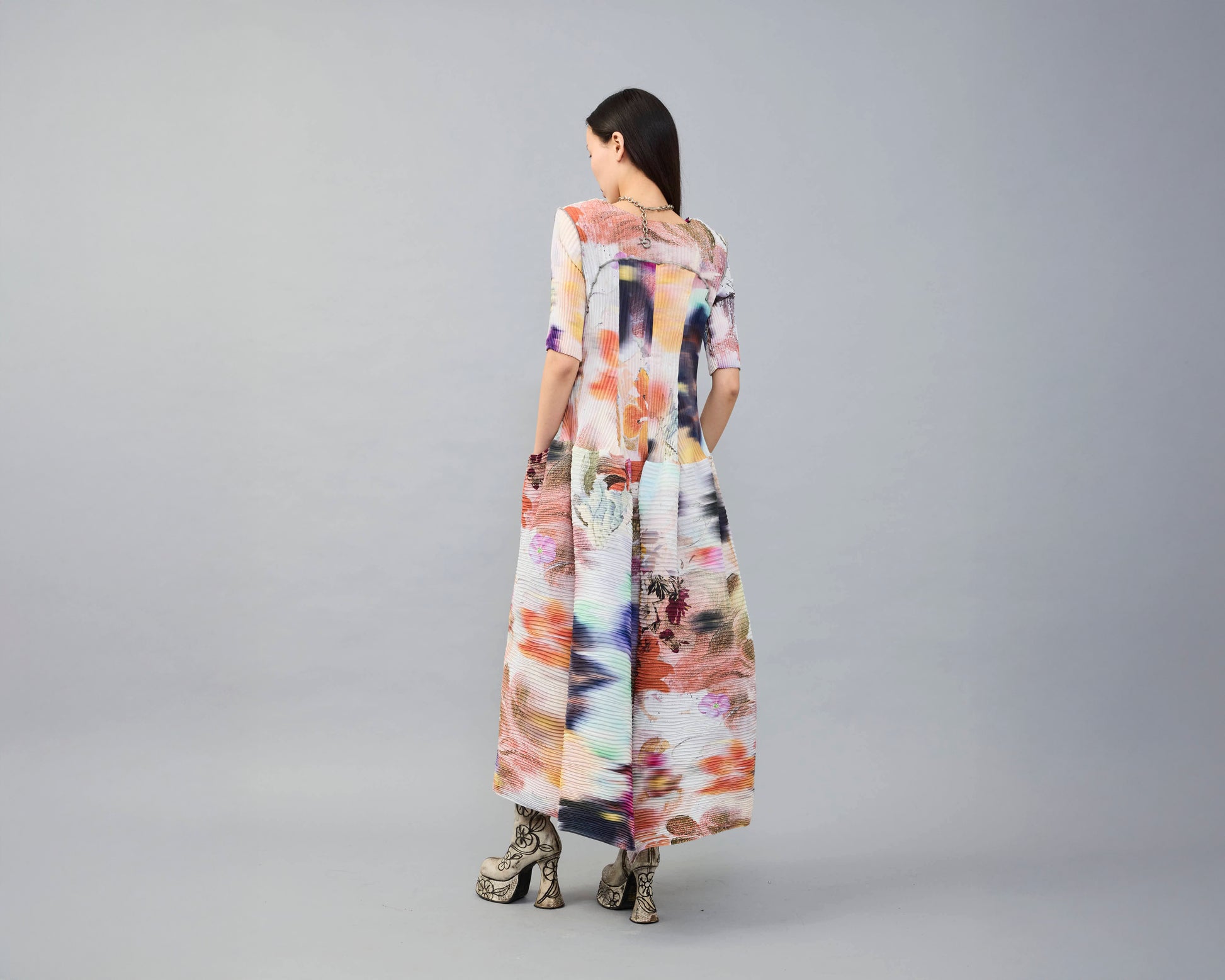 Das Kleid kommt als Onesize in zwei Längen, midi oder maxi. Jedes Stück ist einzeln von Hand plissiert.