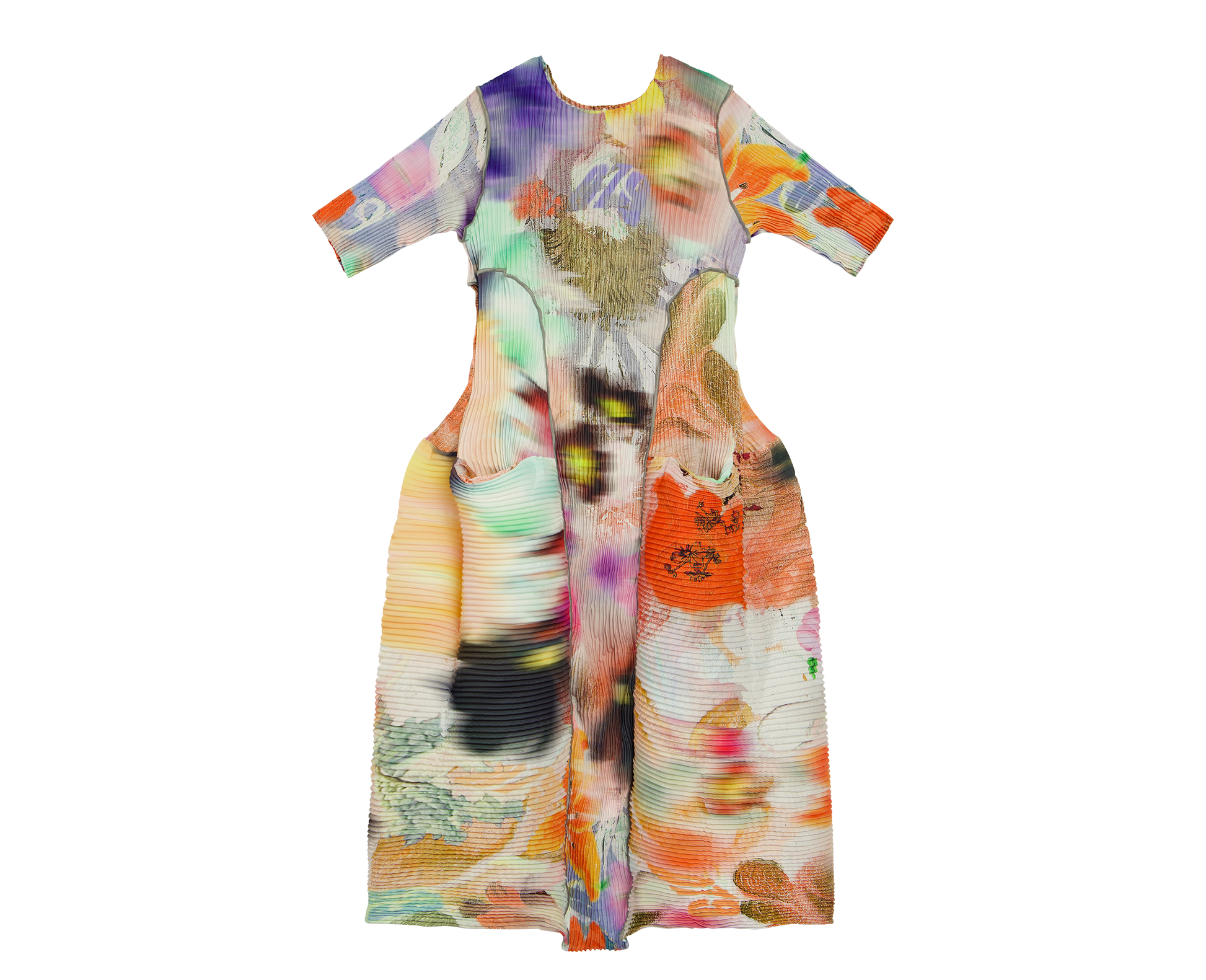Langes, plissiertes Kleid mit zwei grossen aufgesetzten Taschen und weiter Passform.