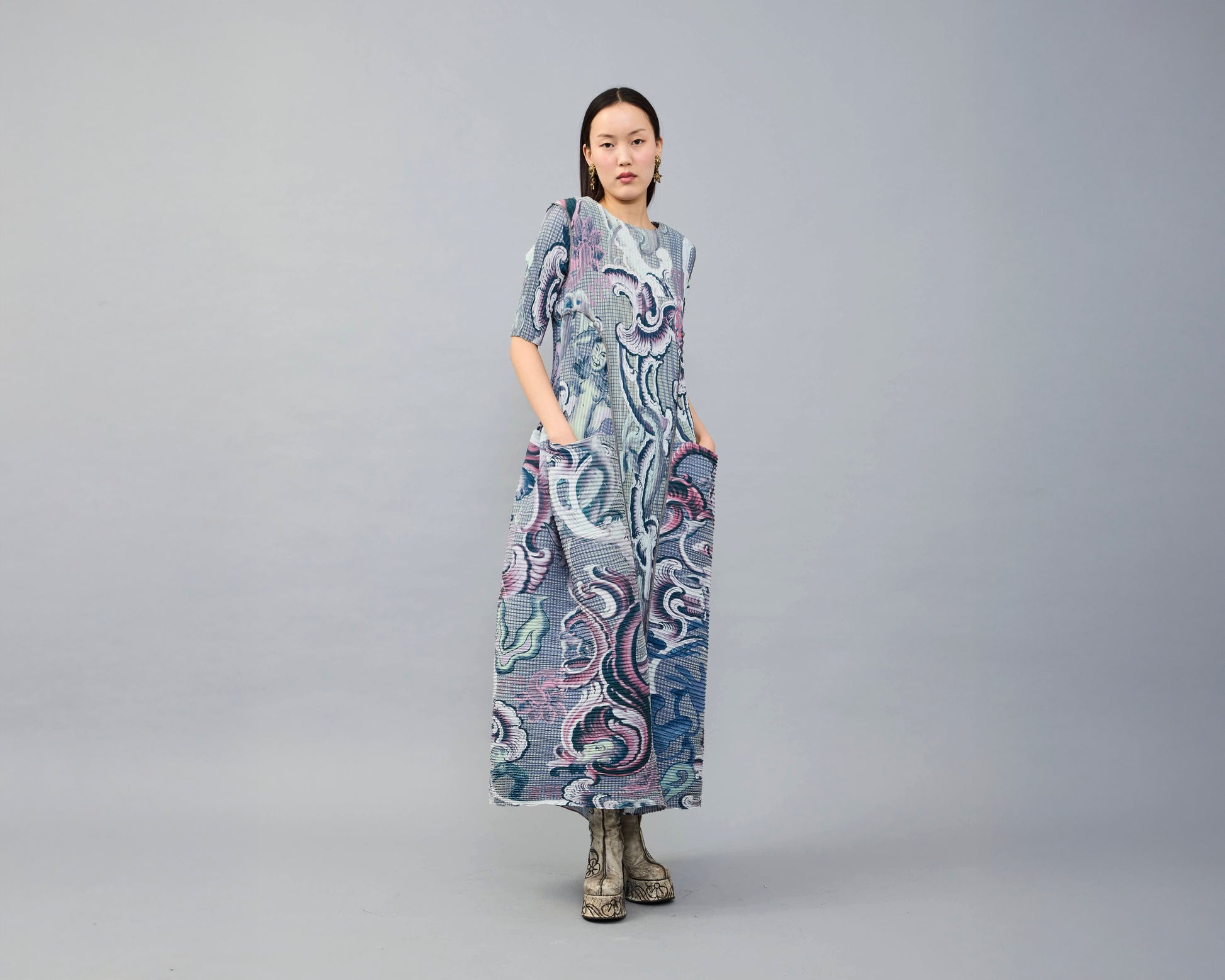 Langes, plissiertes Kleid mit zwei grossen aufgesetzten Taschen und weiter Passform.