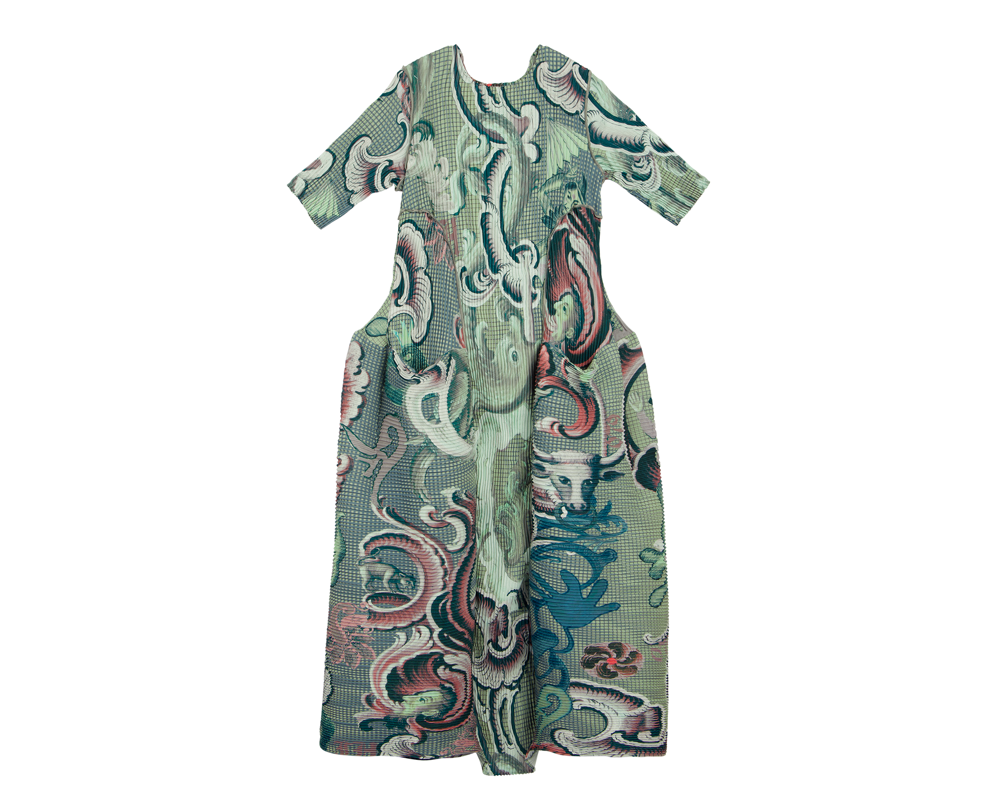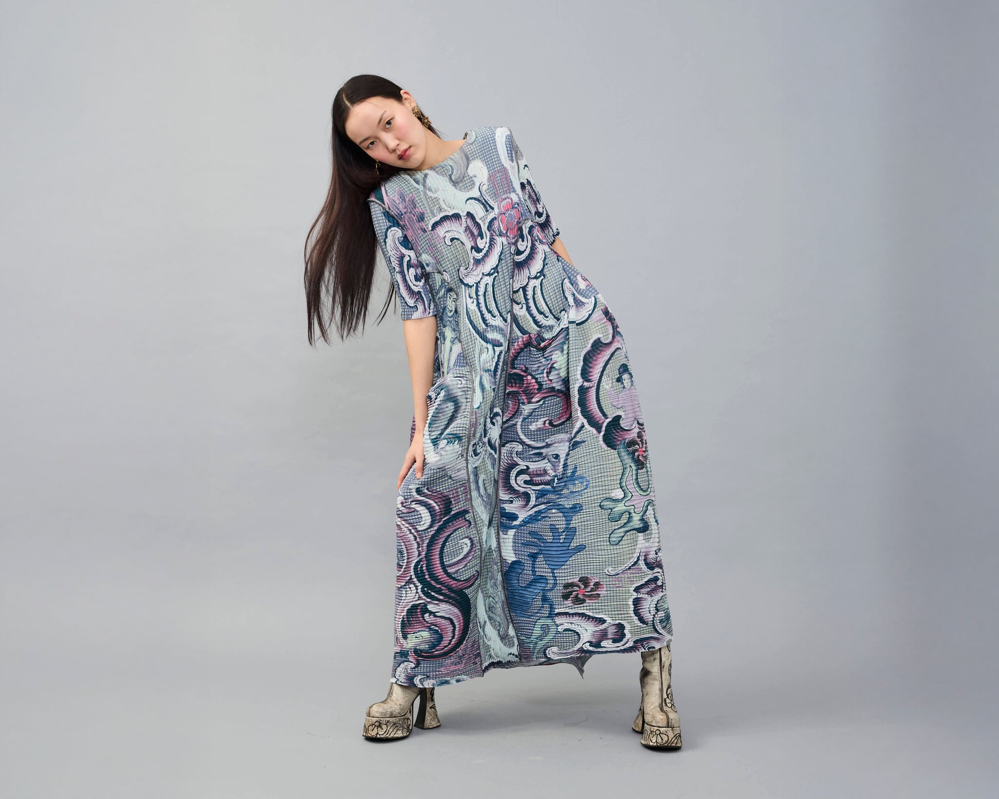 Das Kleid kommt als onesize in zwei Längen, midi oder maxi. Jedes Stück ist einzeln von Hand plissiert.