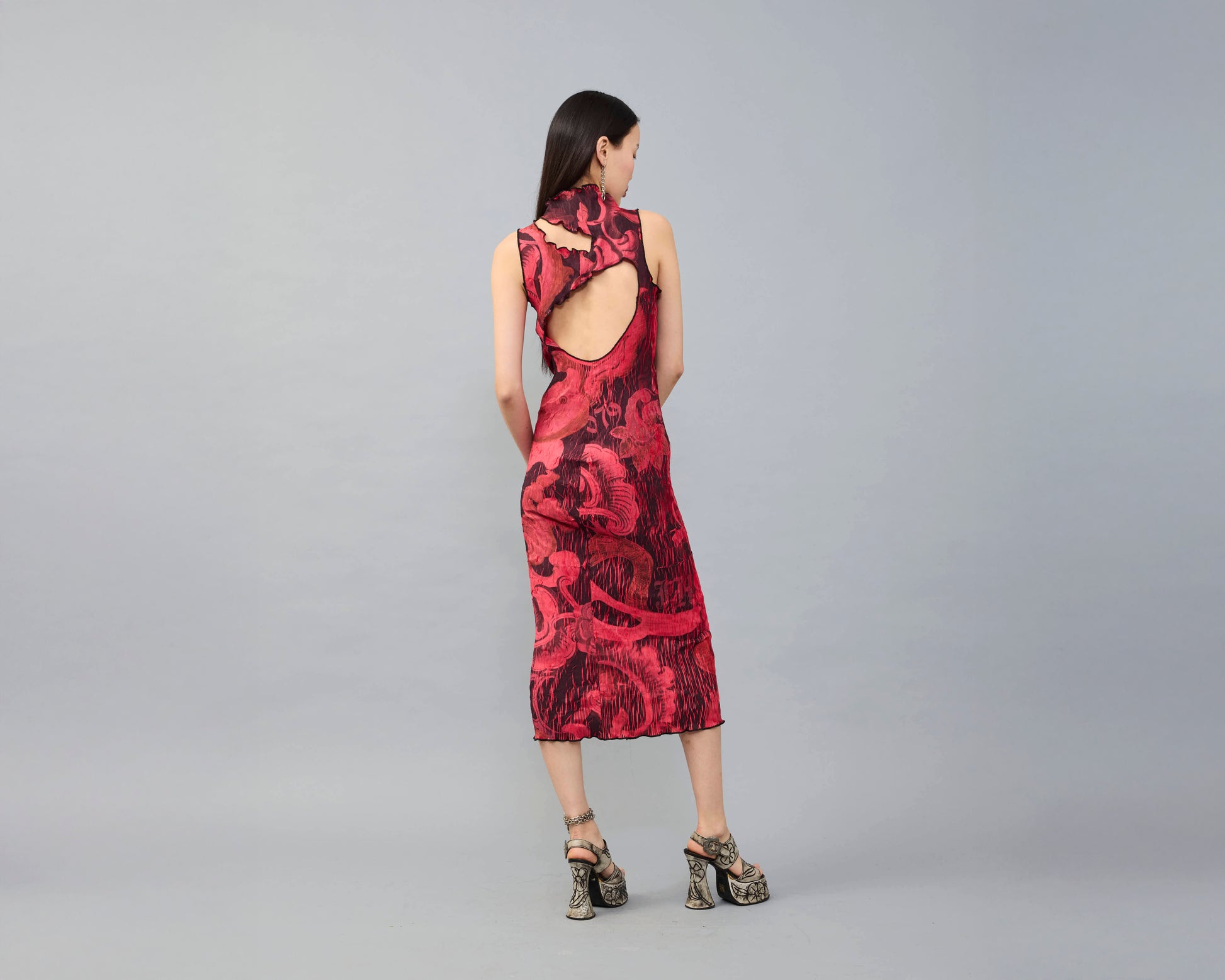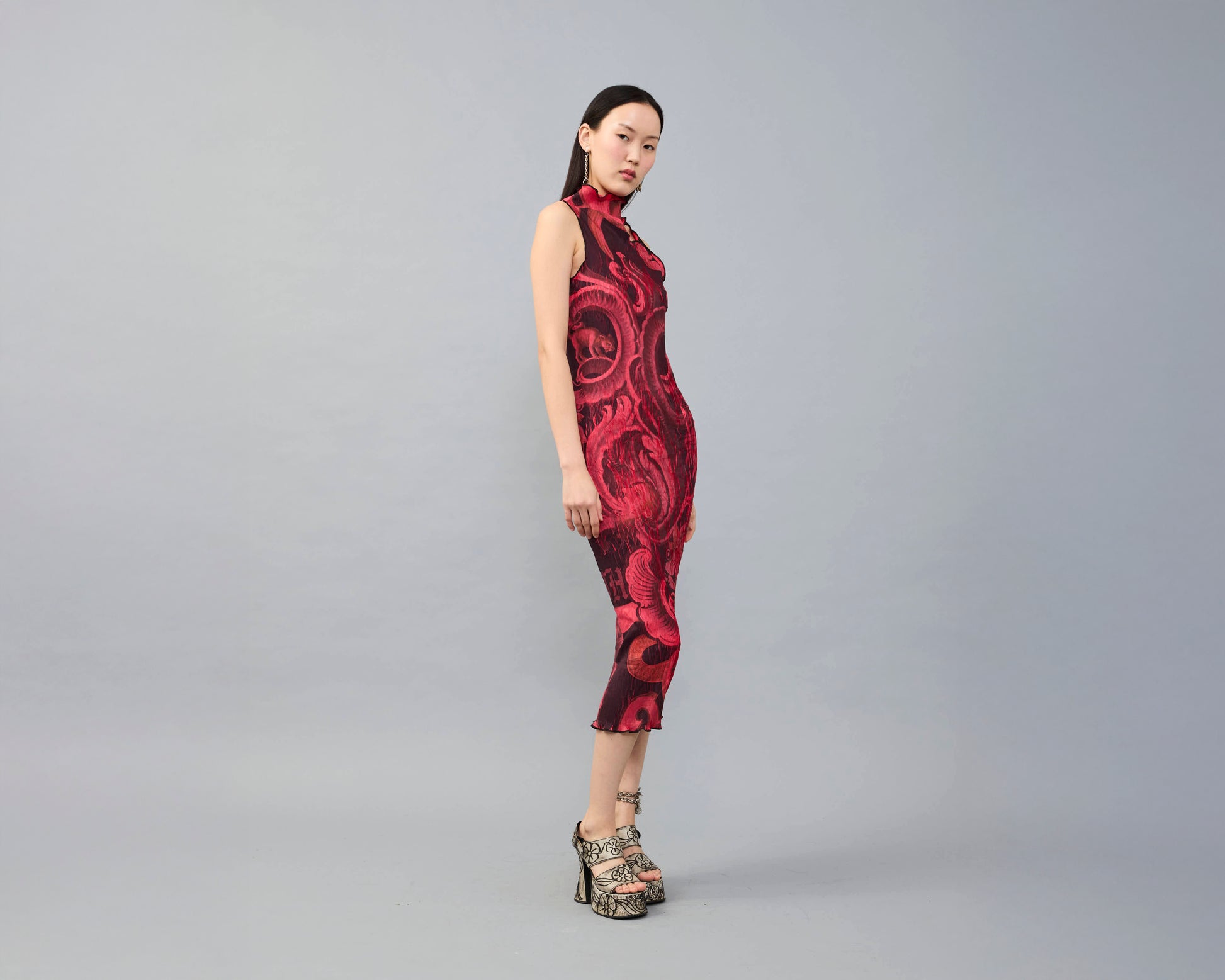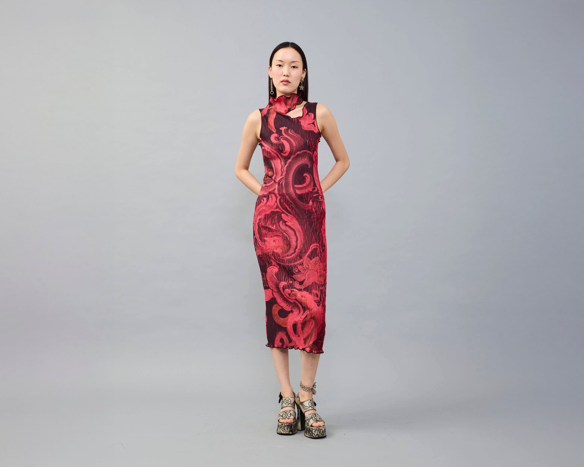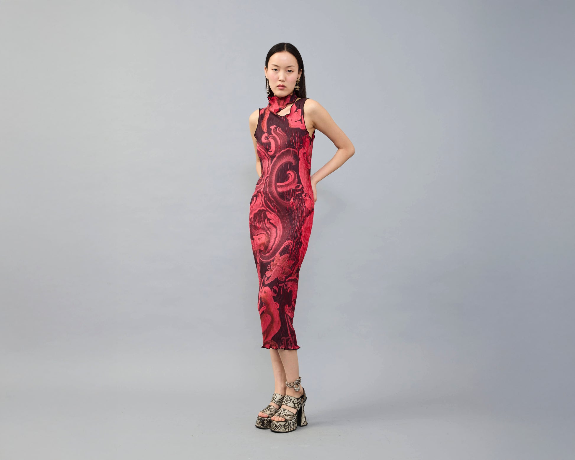 Ärmelloses Kleid in Midilänge, mit Allover Print und und körpernahem Schnitt.