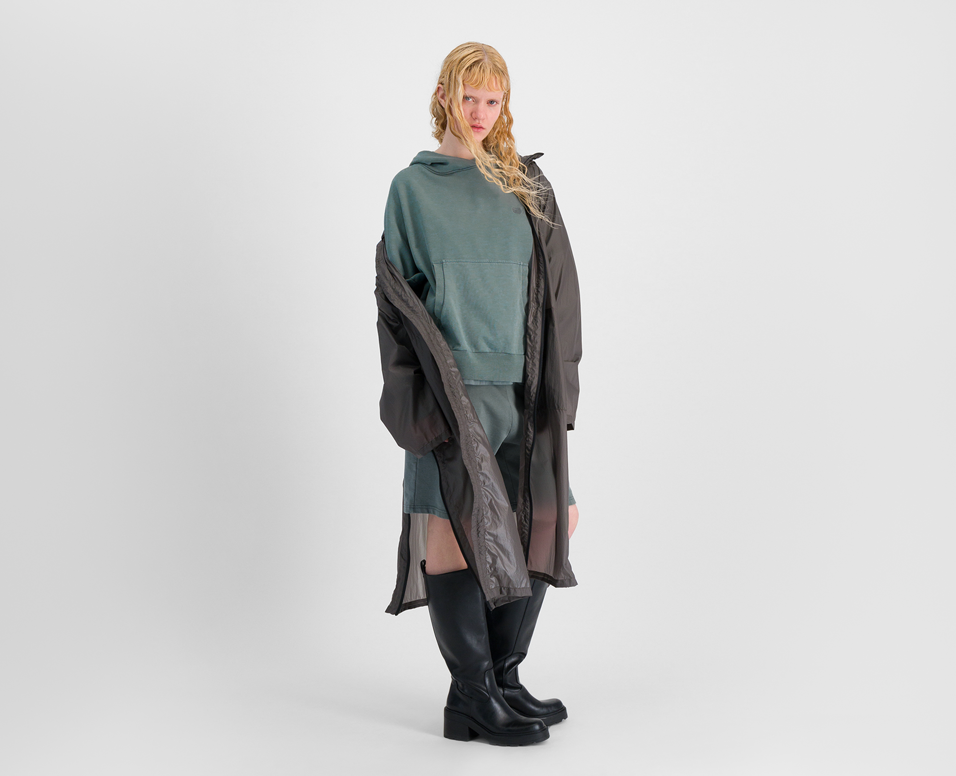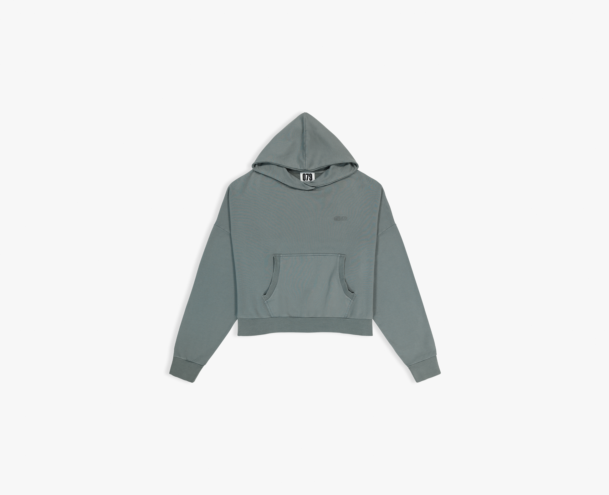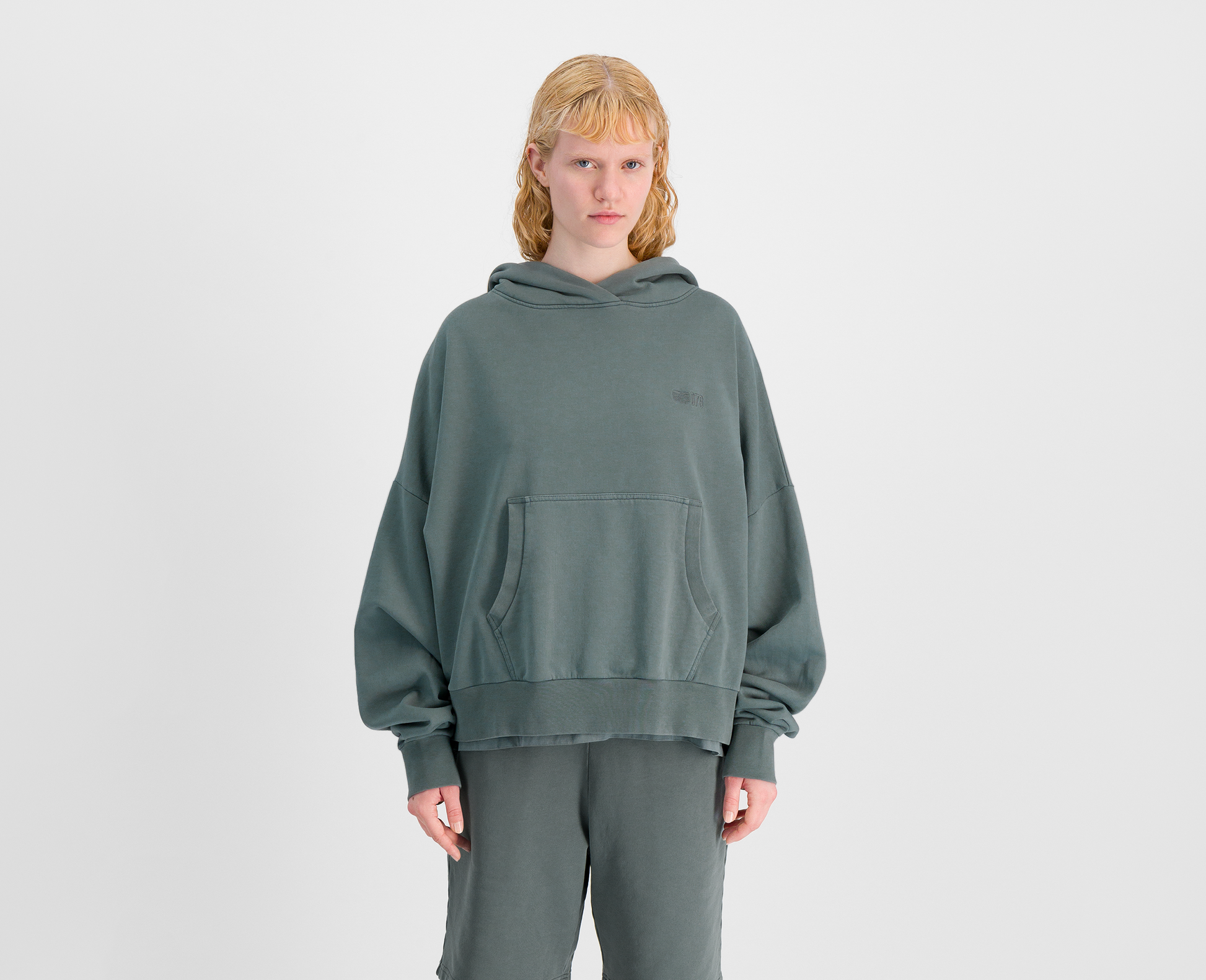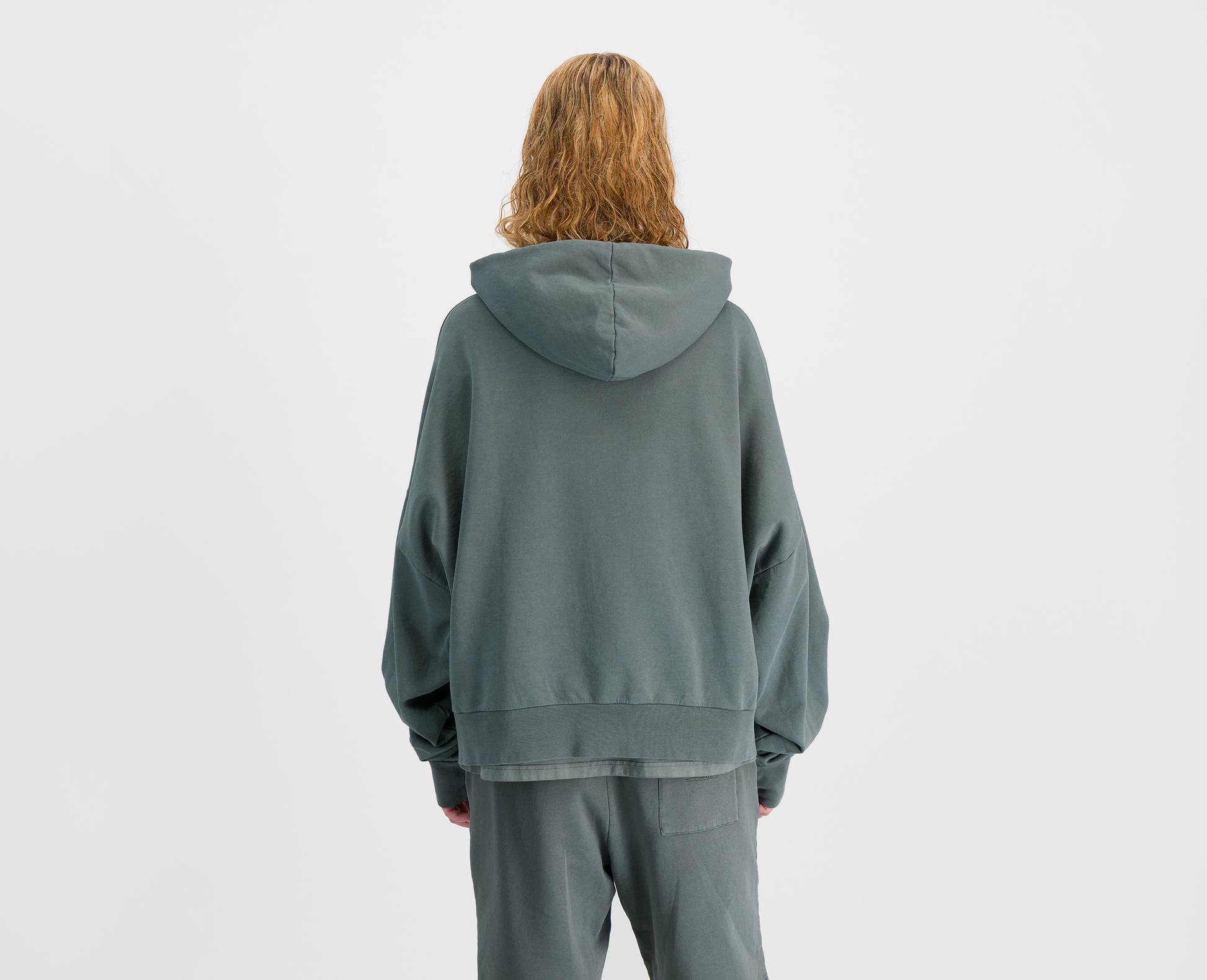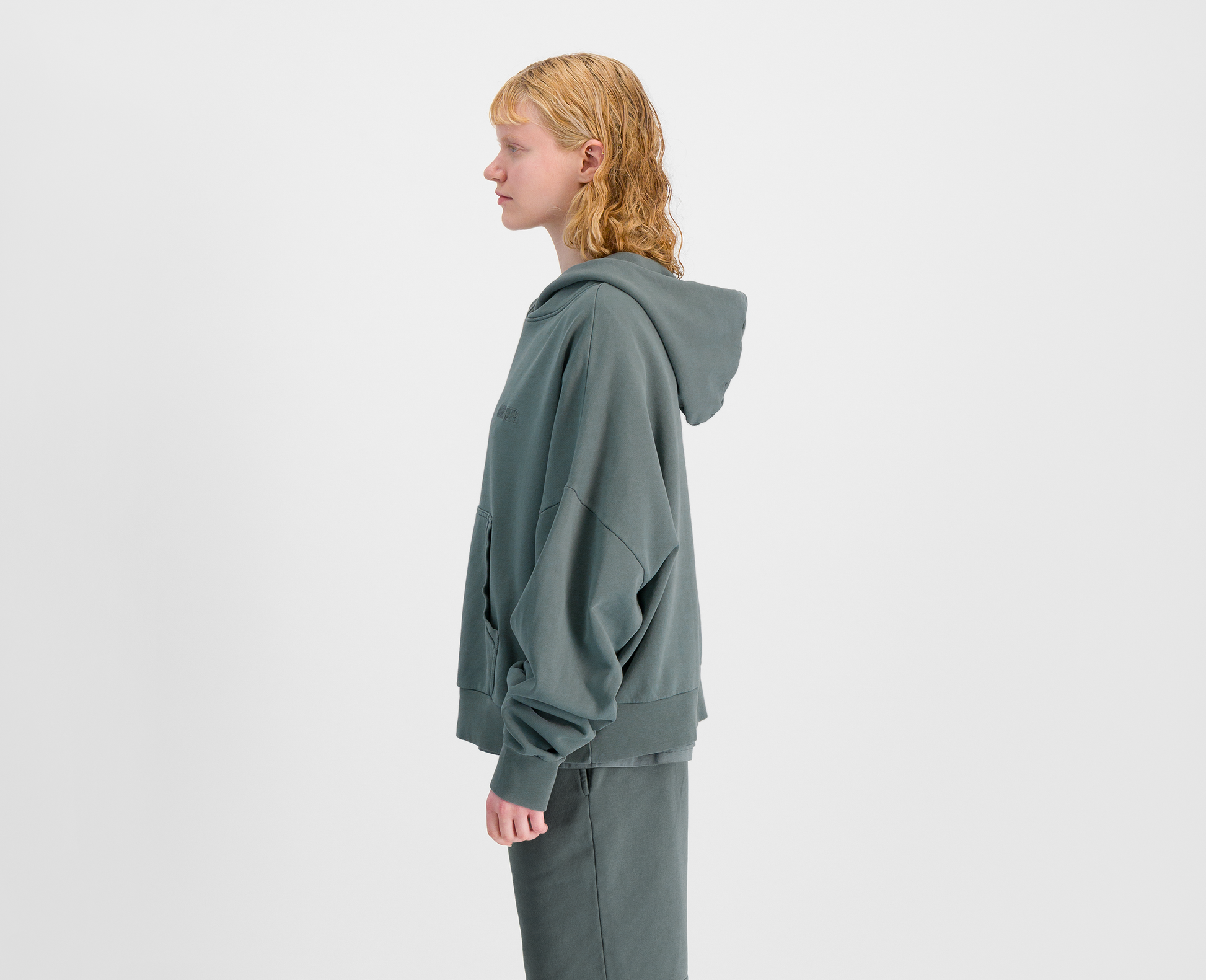 Oversized hoodie with overlapping shoulder seams and slightly shortened hem made from 100% organic cotton.