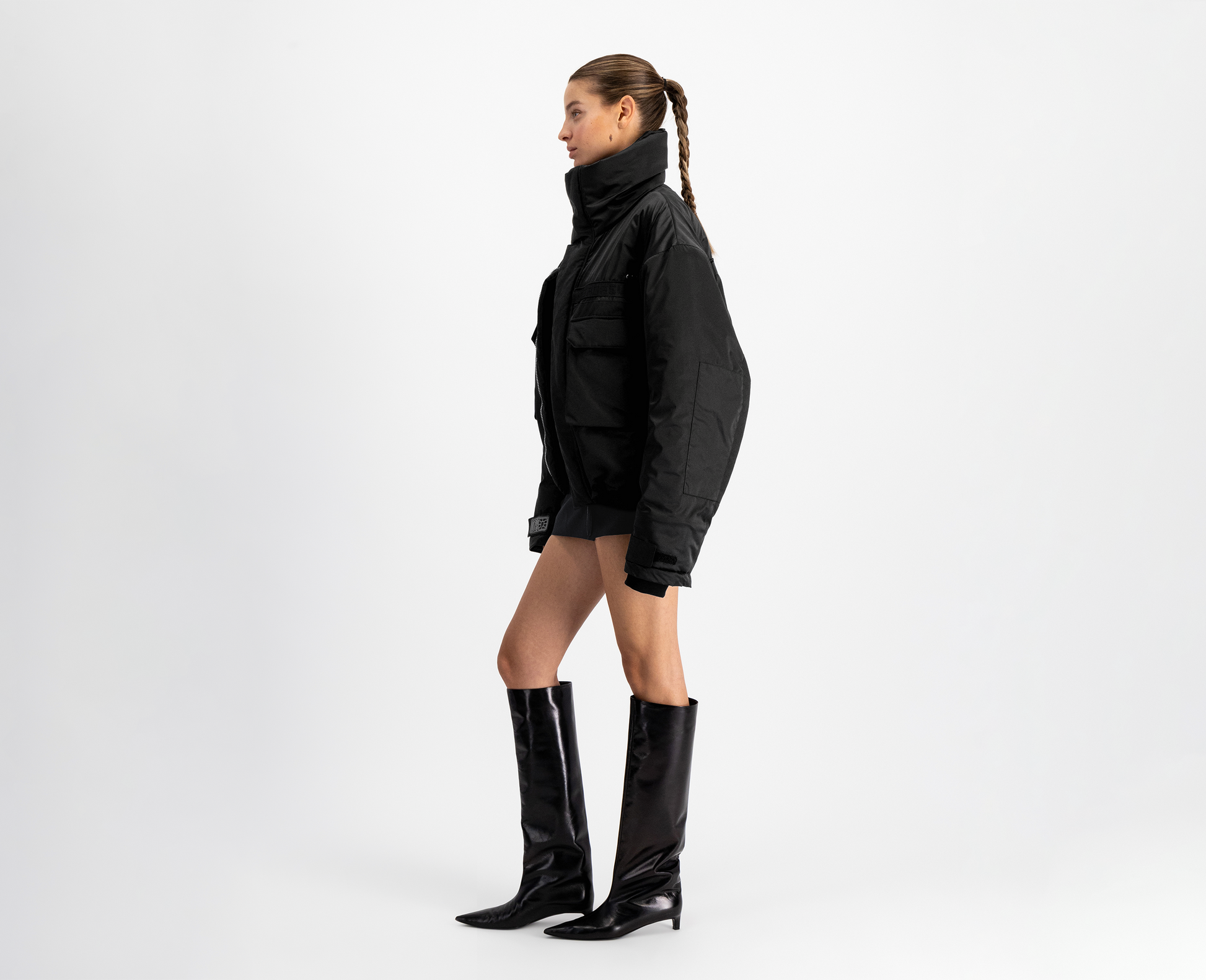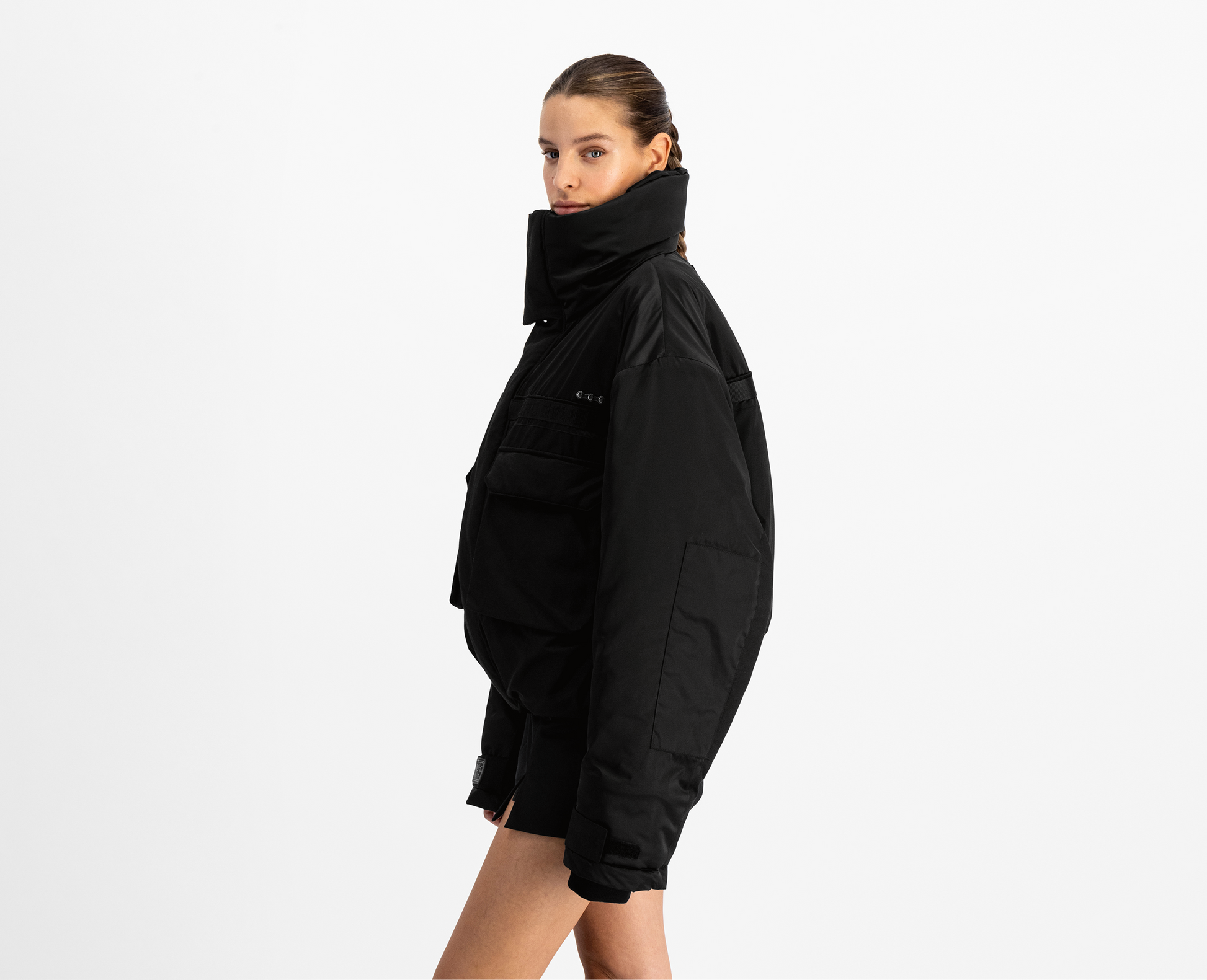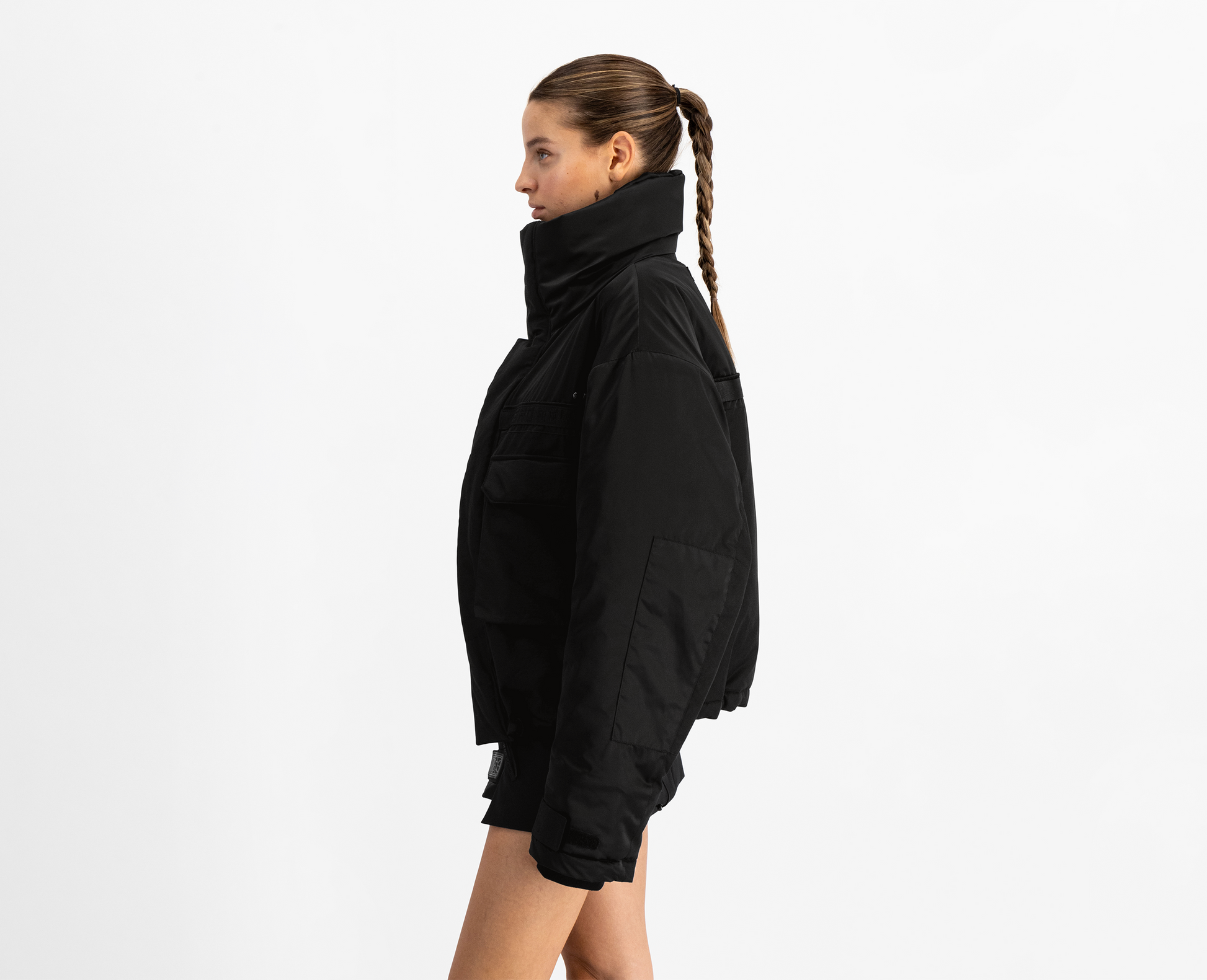 Jacket in cropped style, high collar, large front pockets and reflective details. Made in Switzerland.