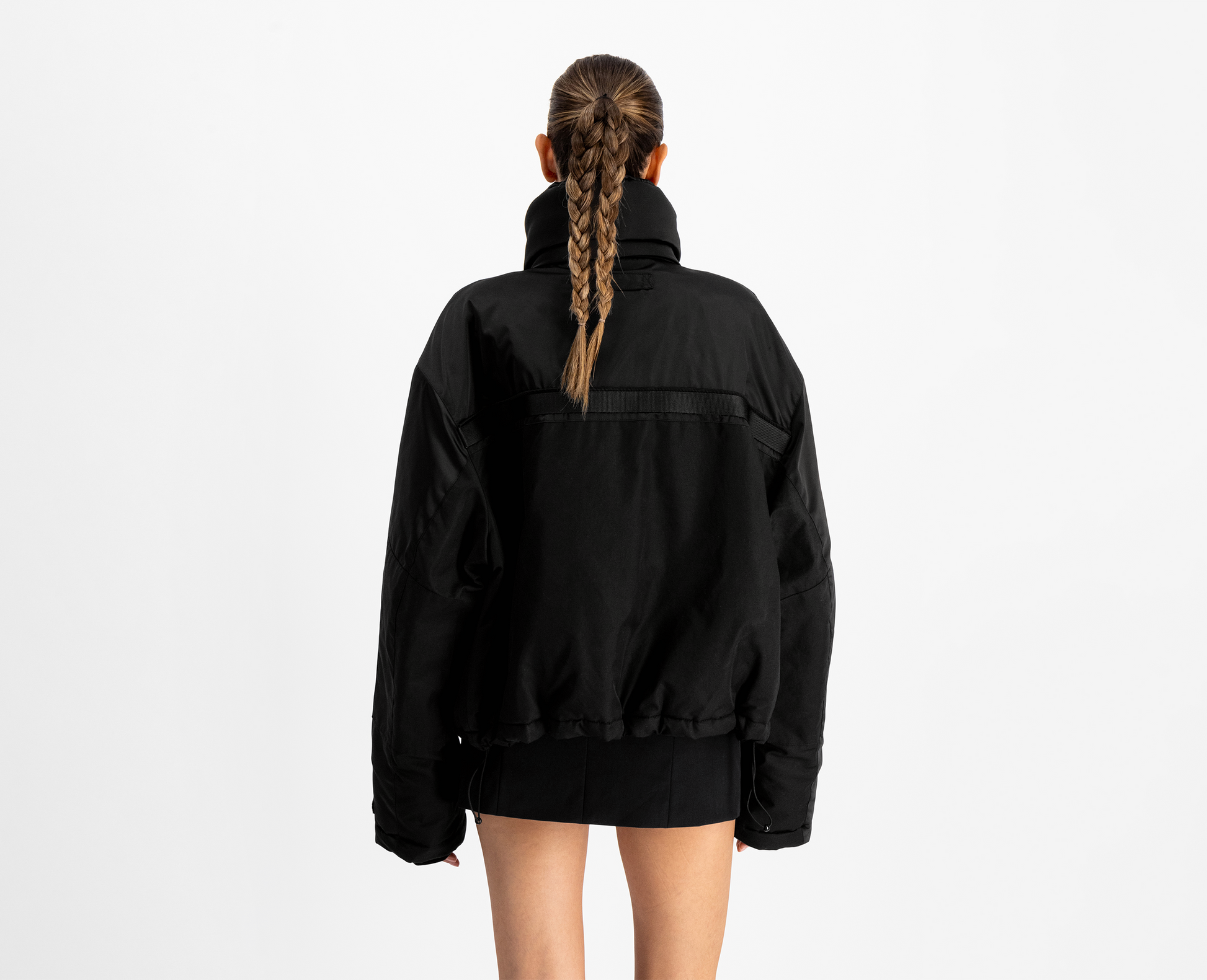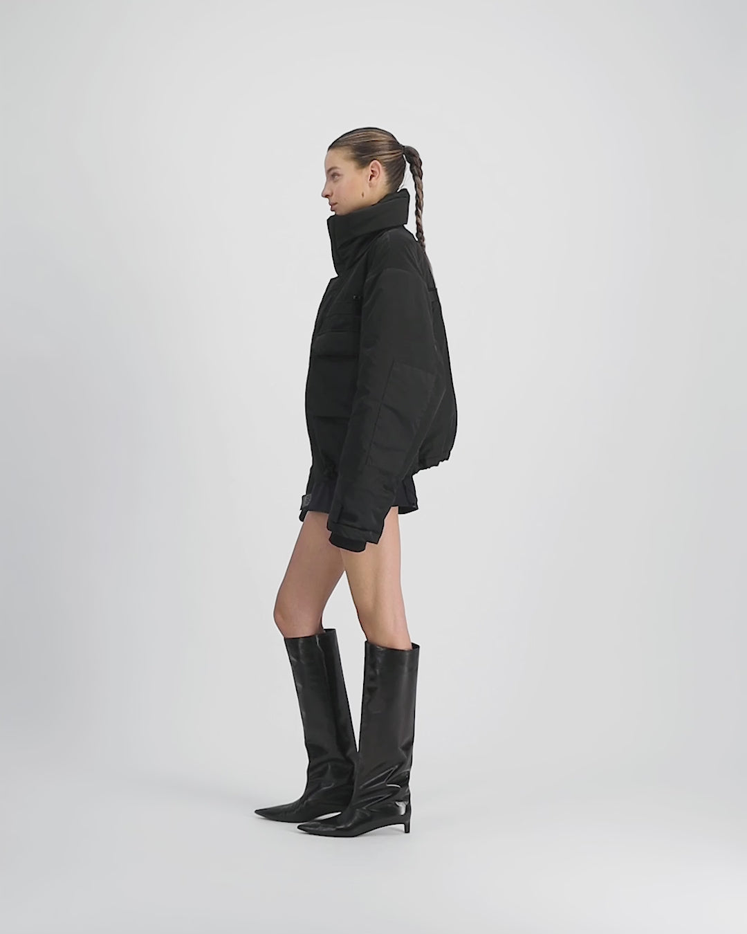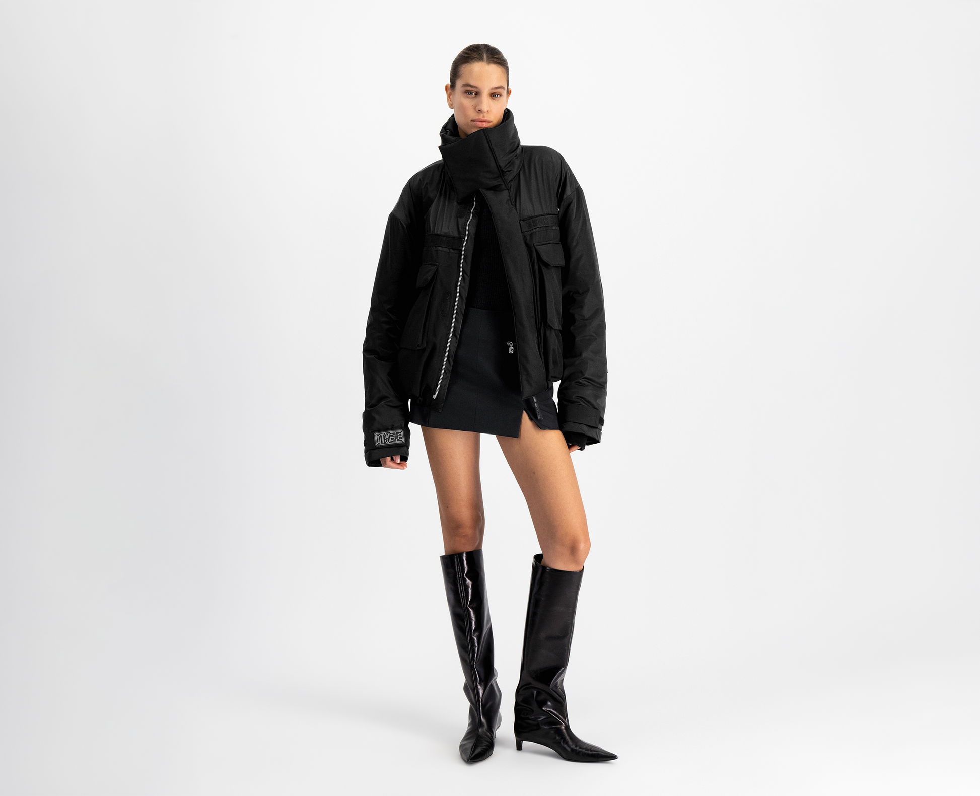 Jacket in cropped style, high collar, large front pockets and reflective details. Made in Switzerland.