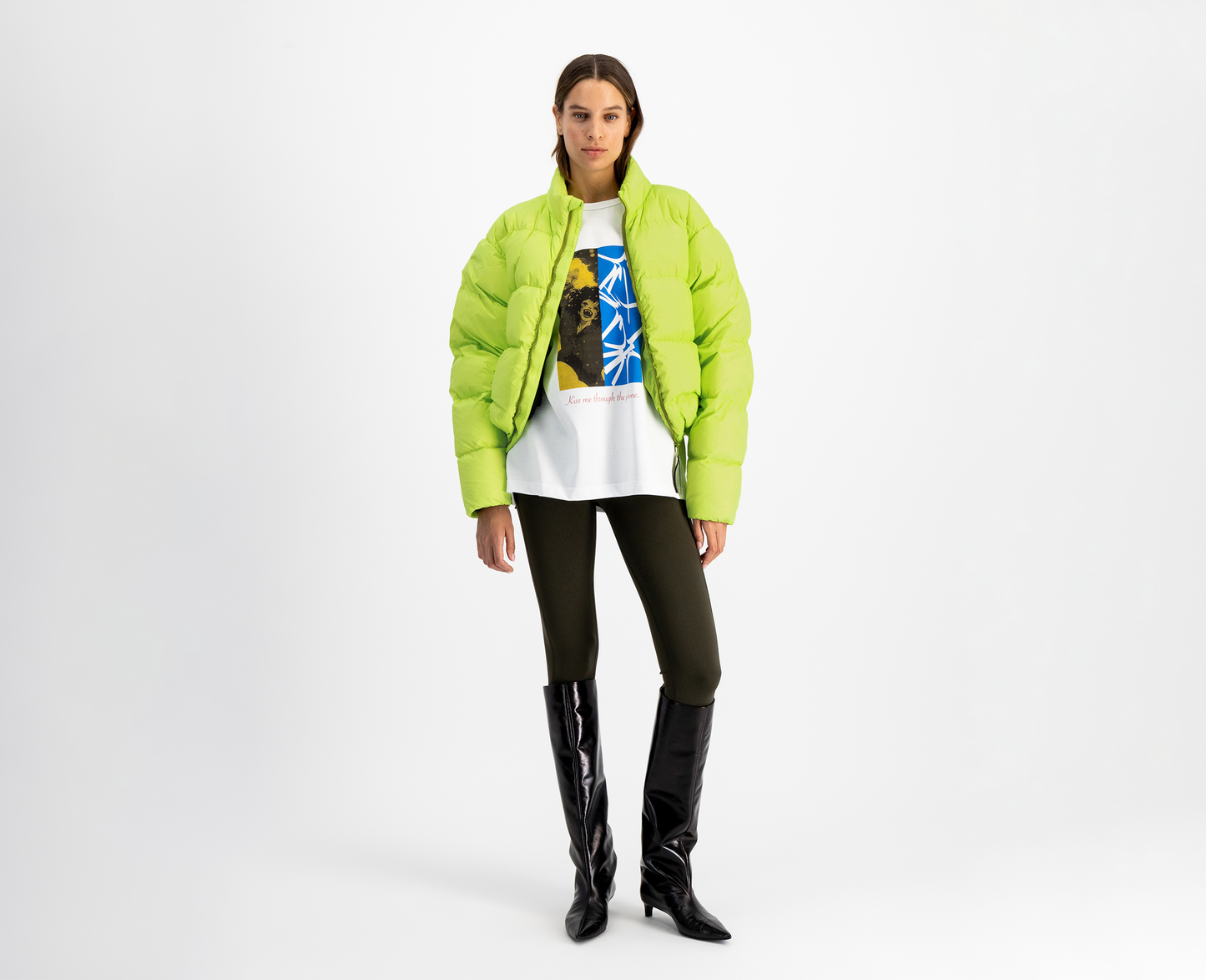 Light weight puffer jacket with side pockets and stand-up collar, loose fit.