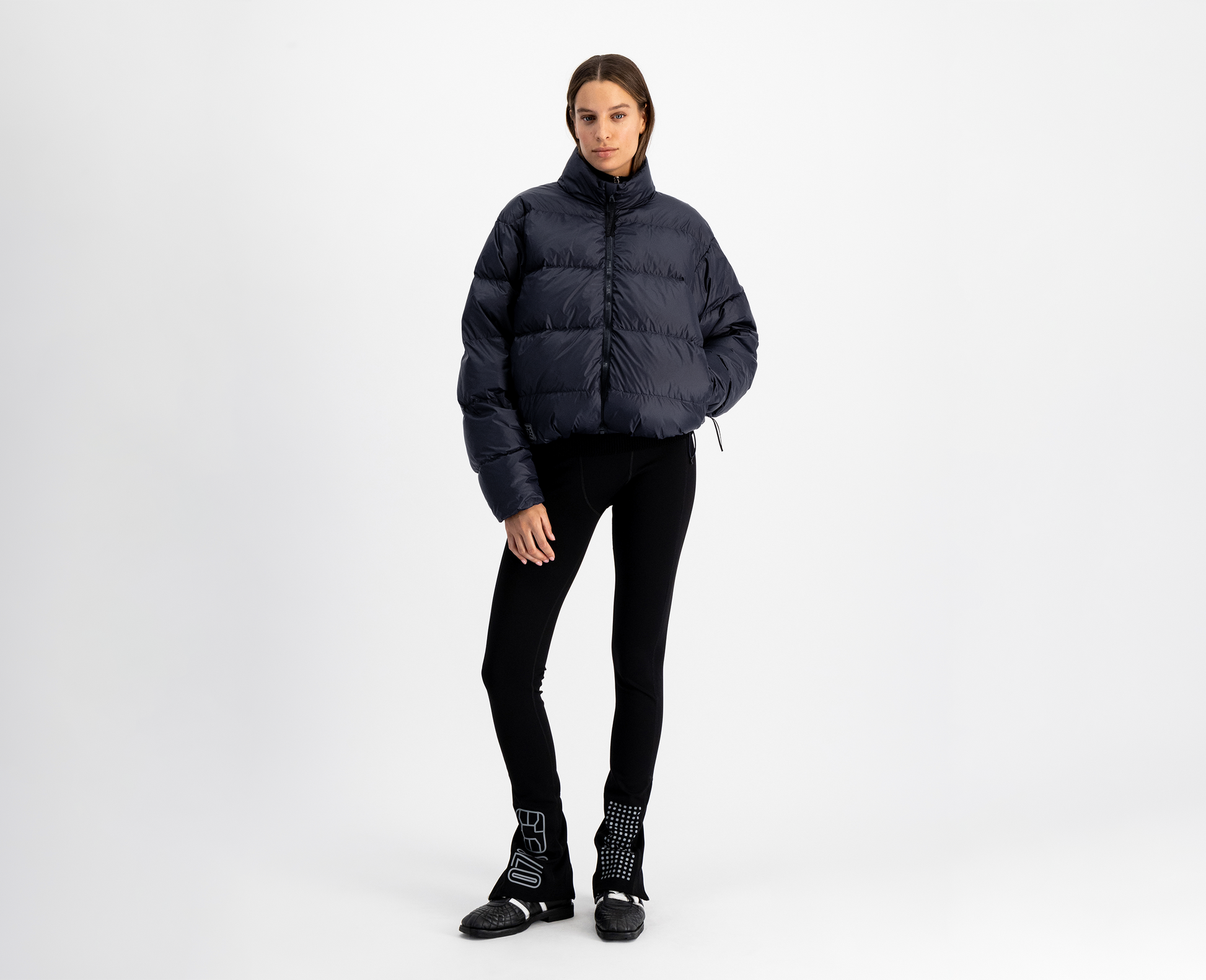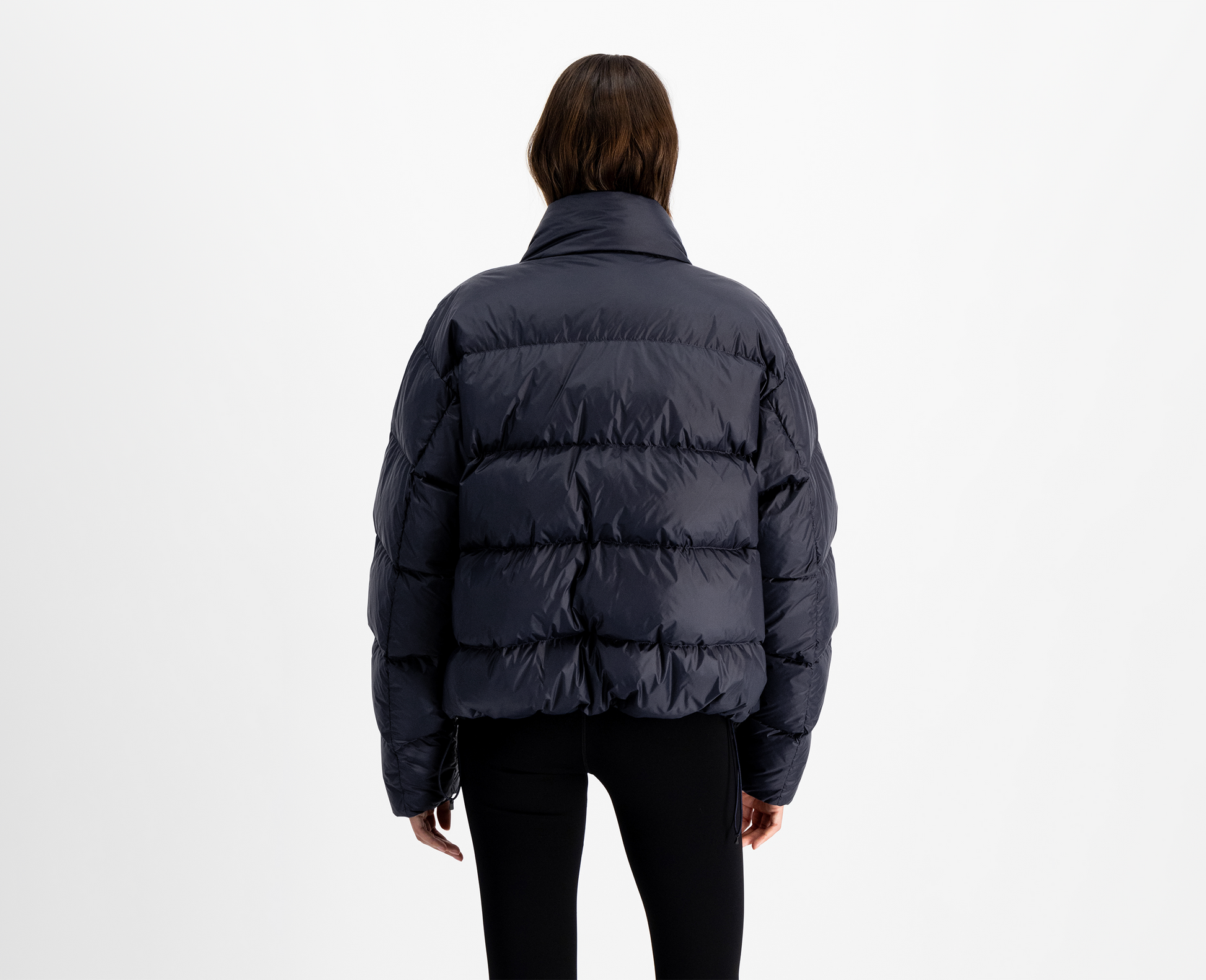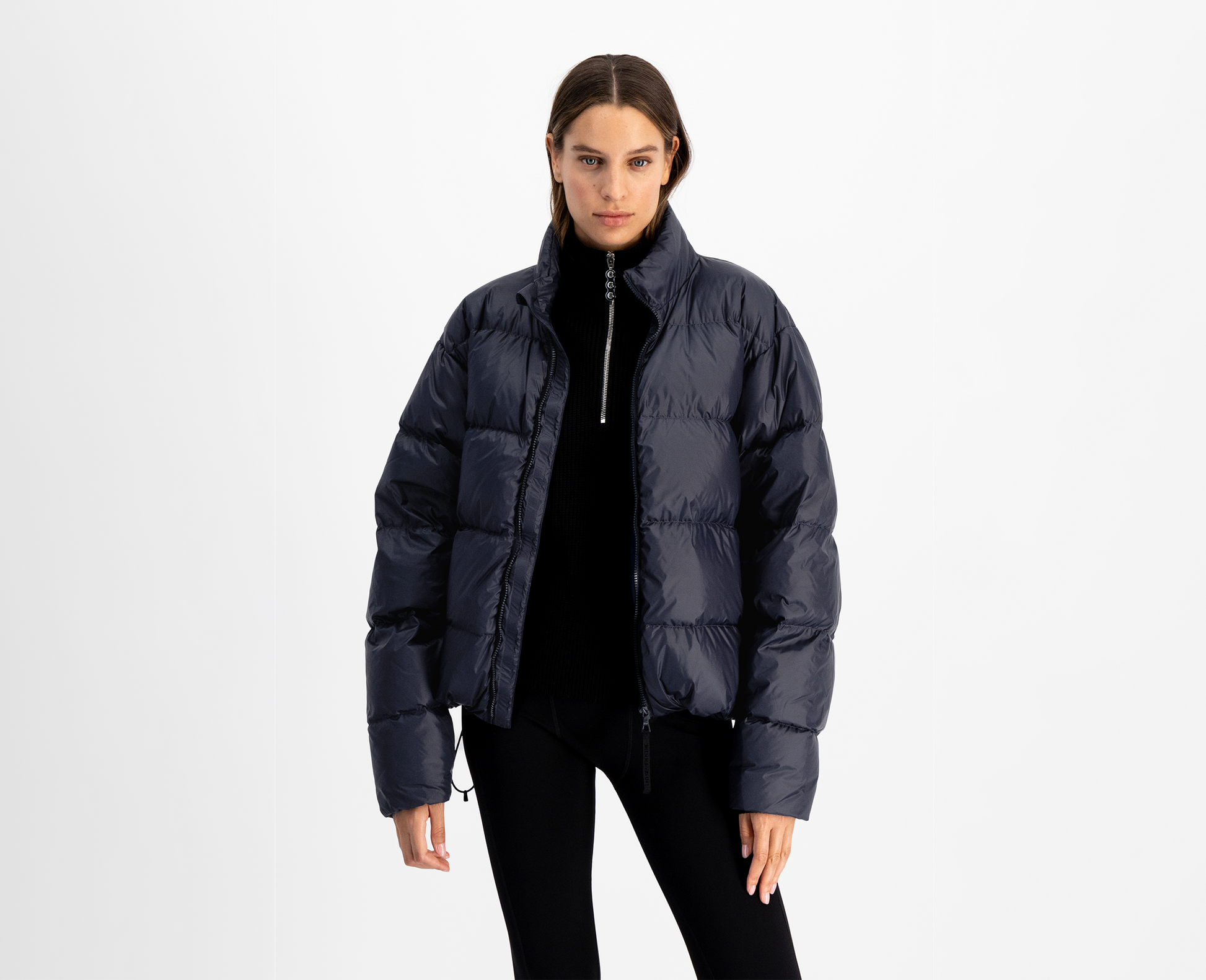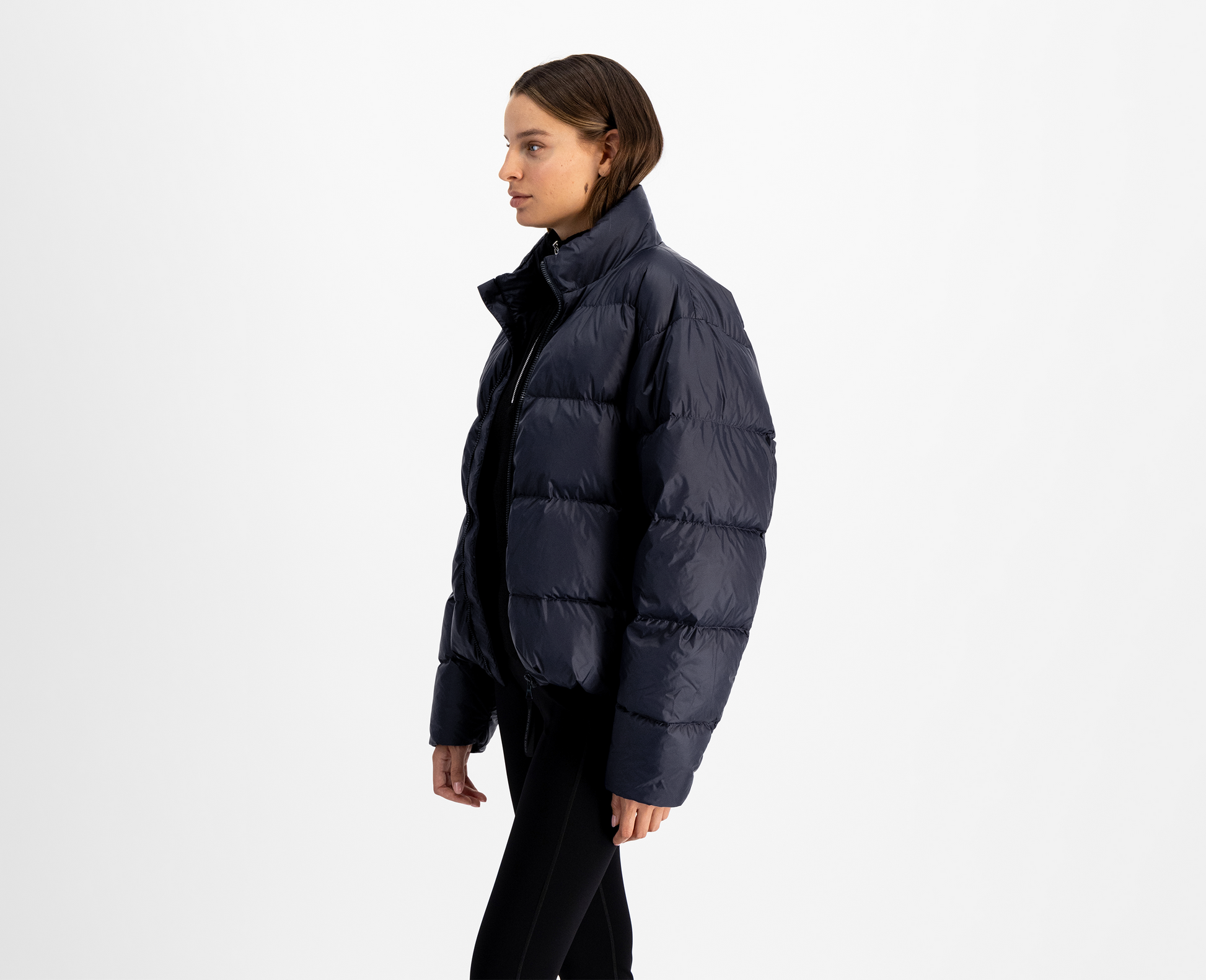 Light weight puffer jacket with side pockets and stand-up collar, loose fit.