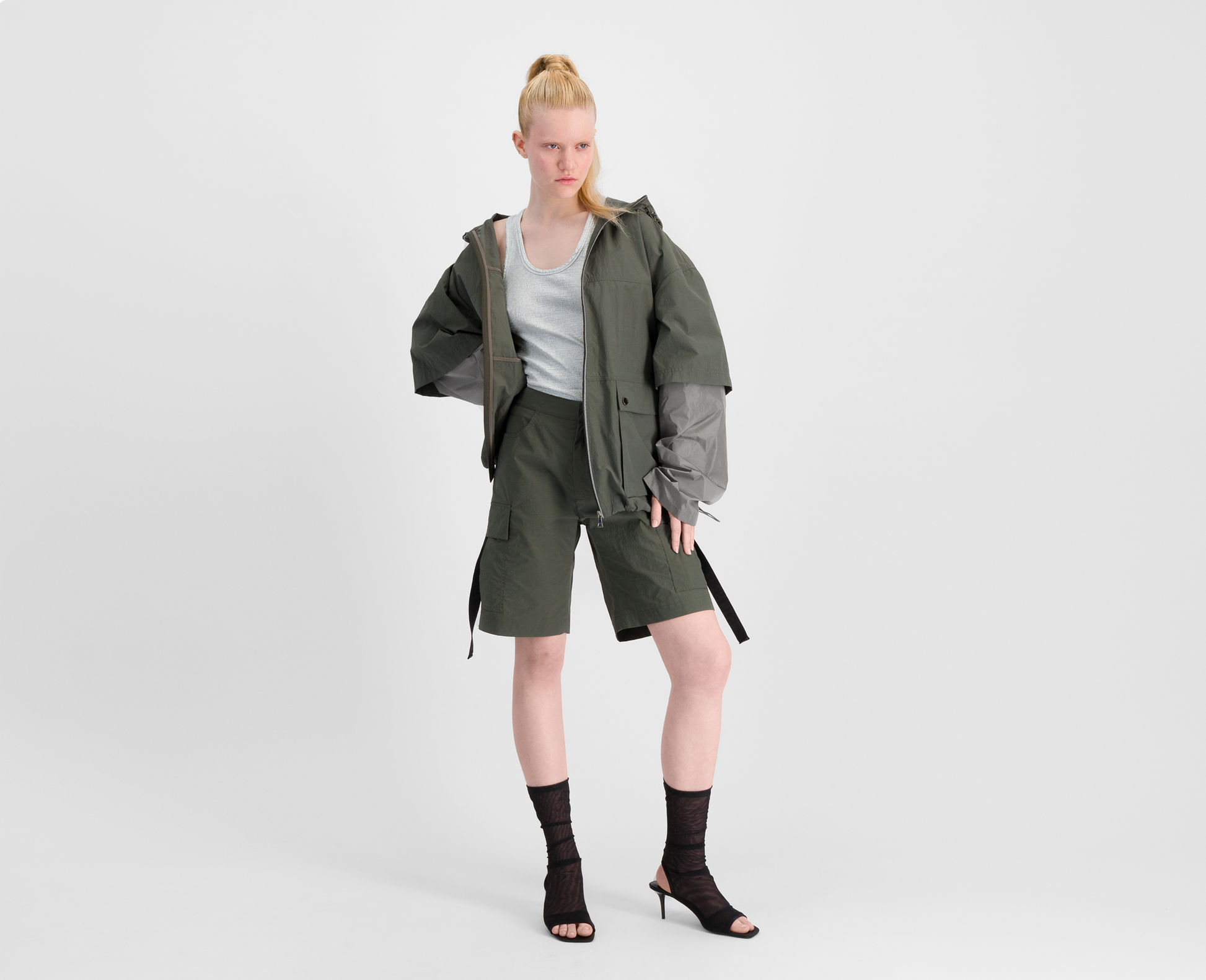 Lightweight jacket with a loose fit, adjustable hem and hood. Made in Switzerland.