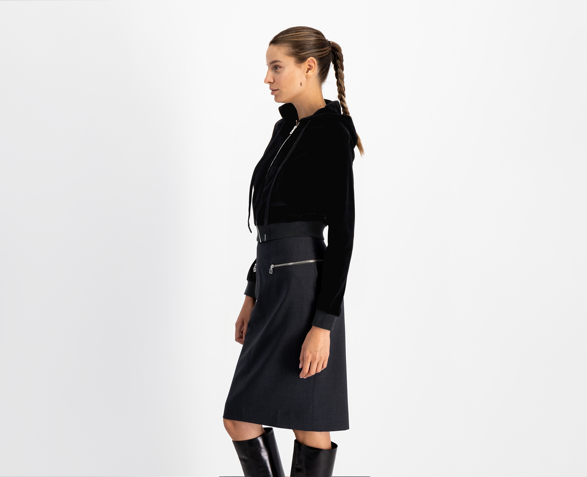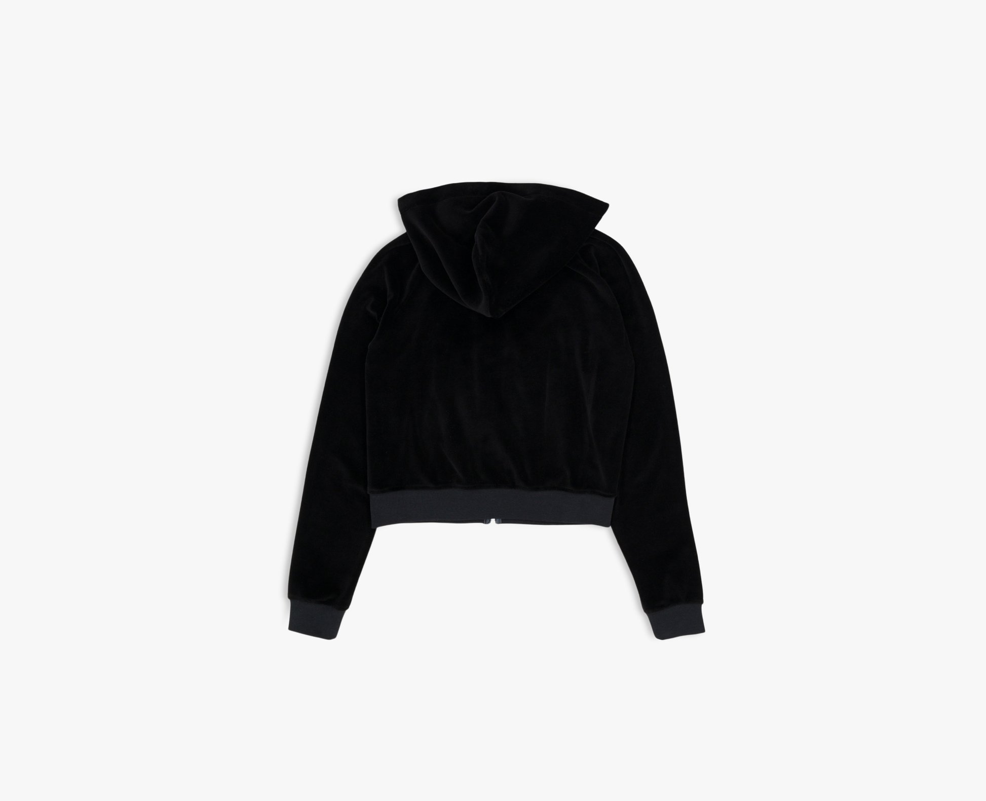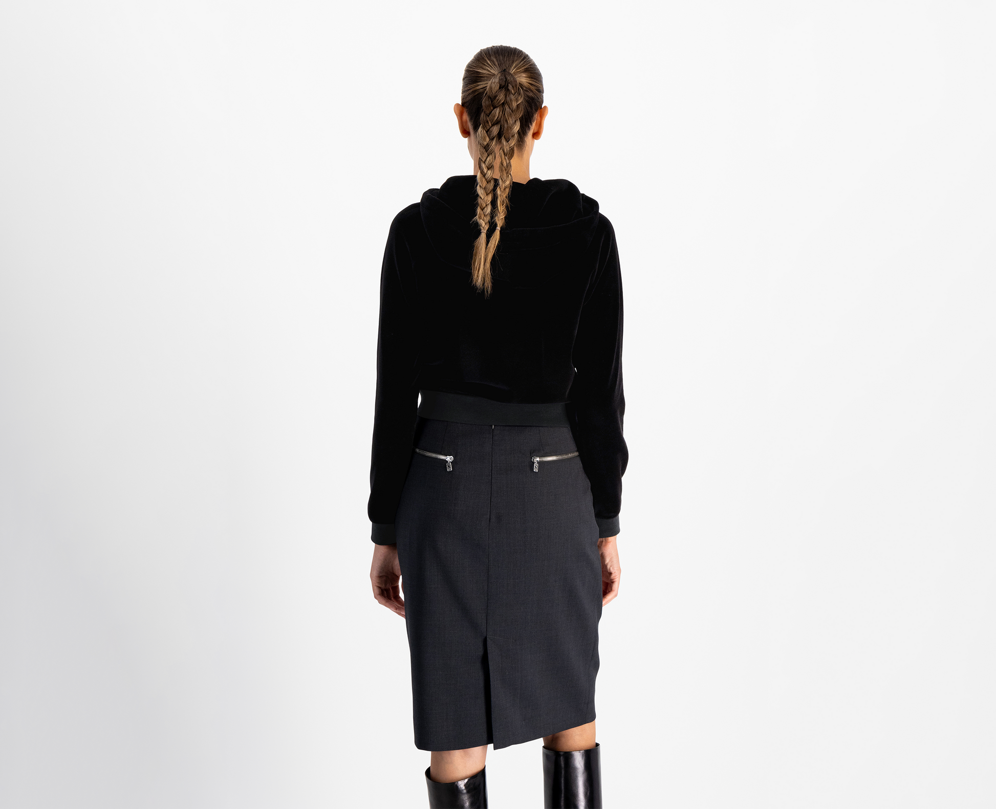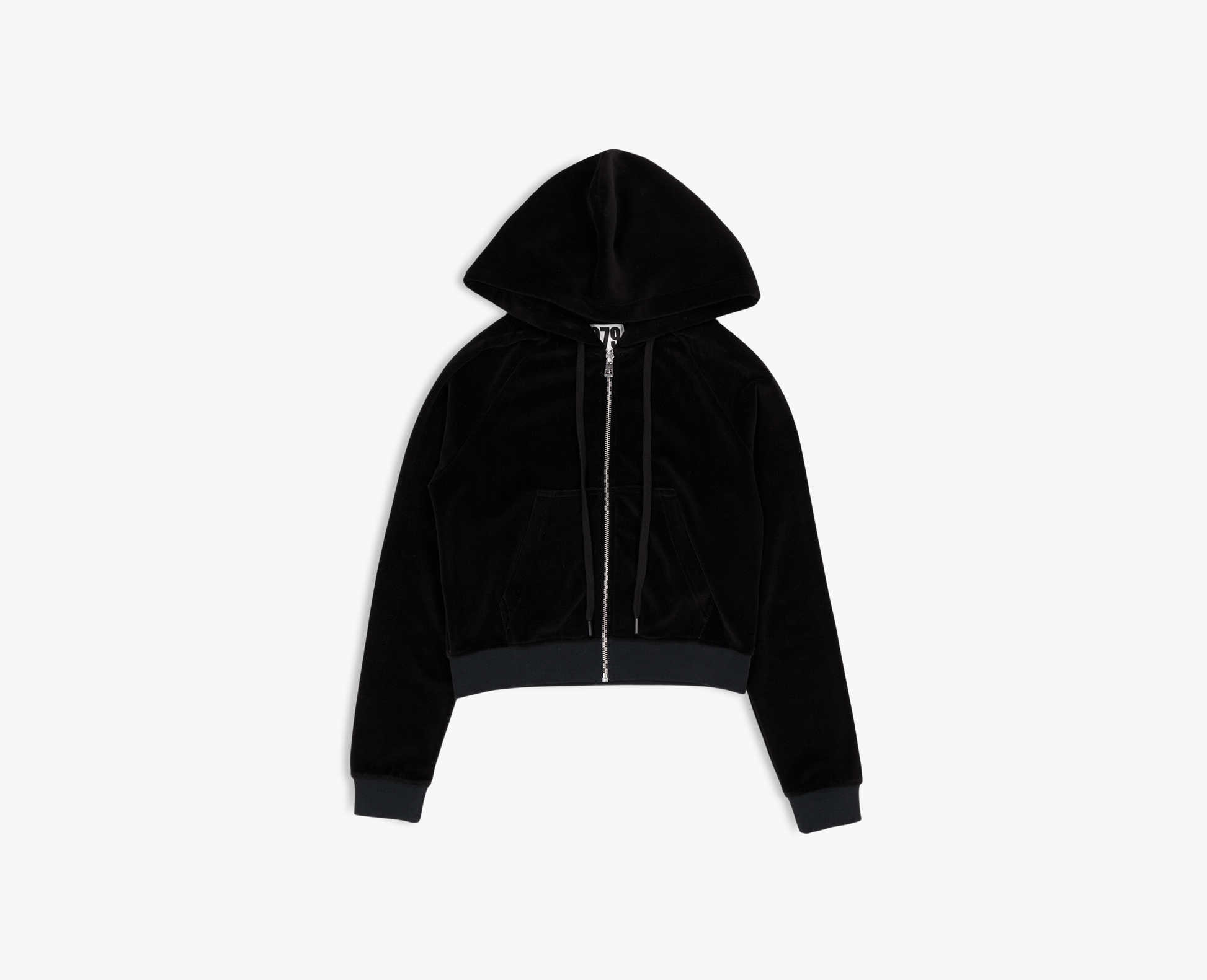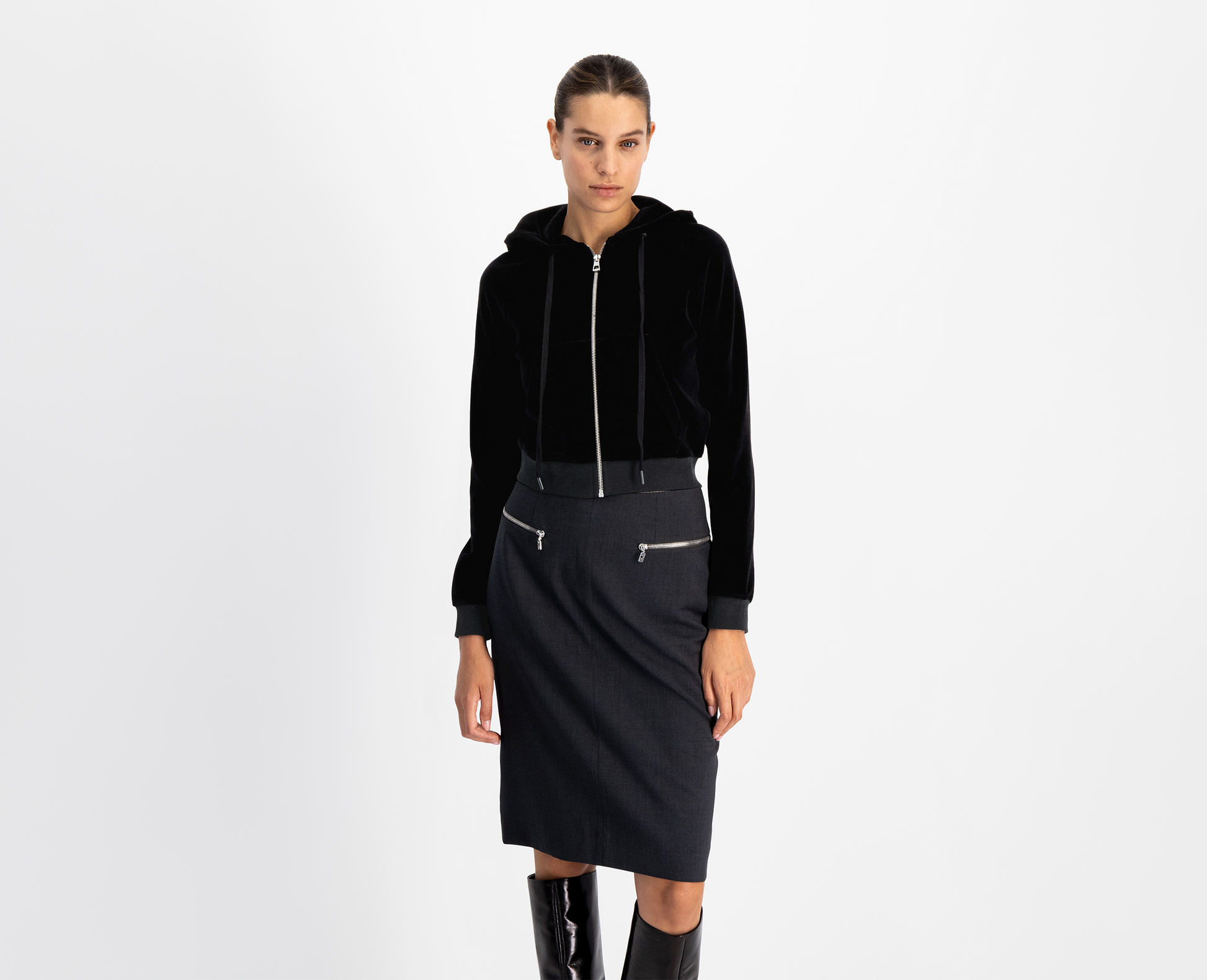 Hooded sweater made of organic cotton velour with a zipper and drawstring.
