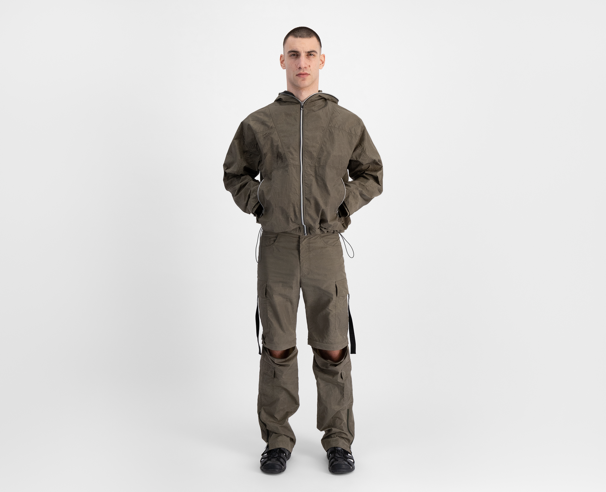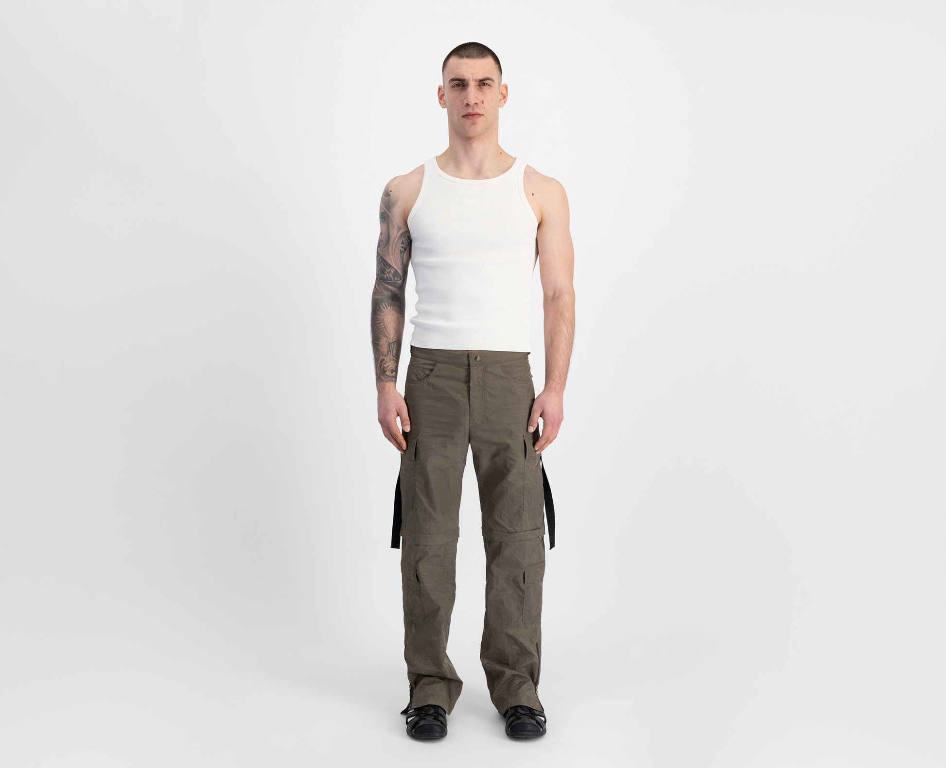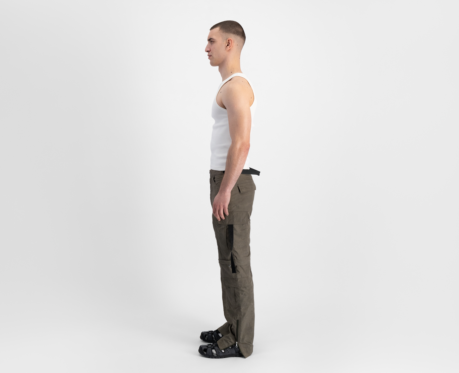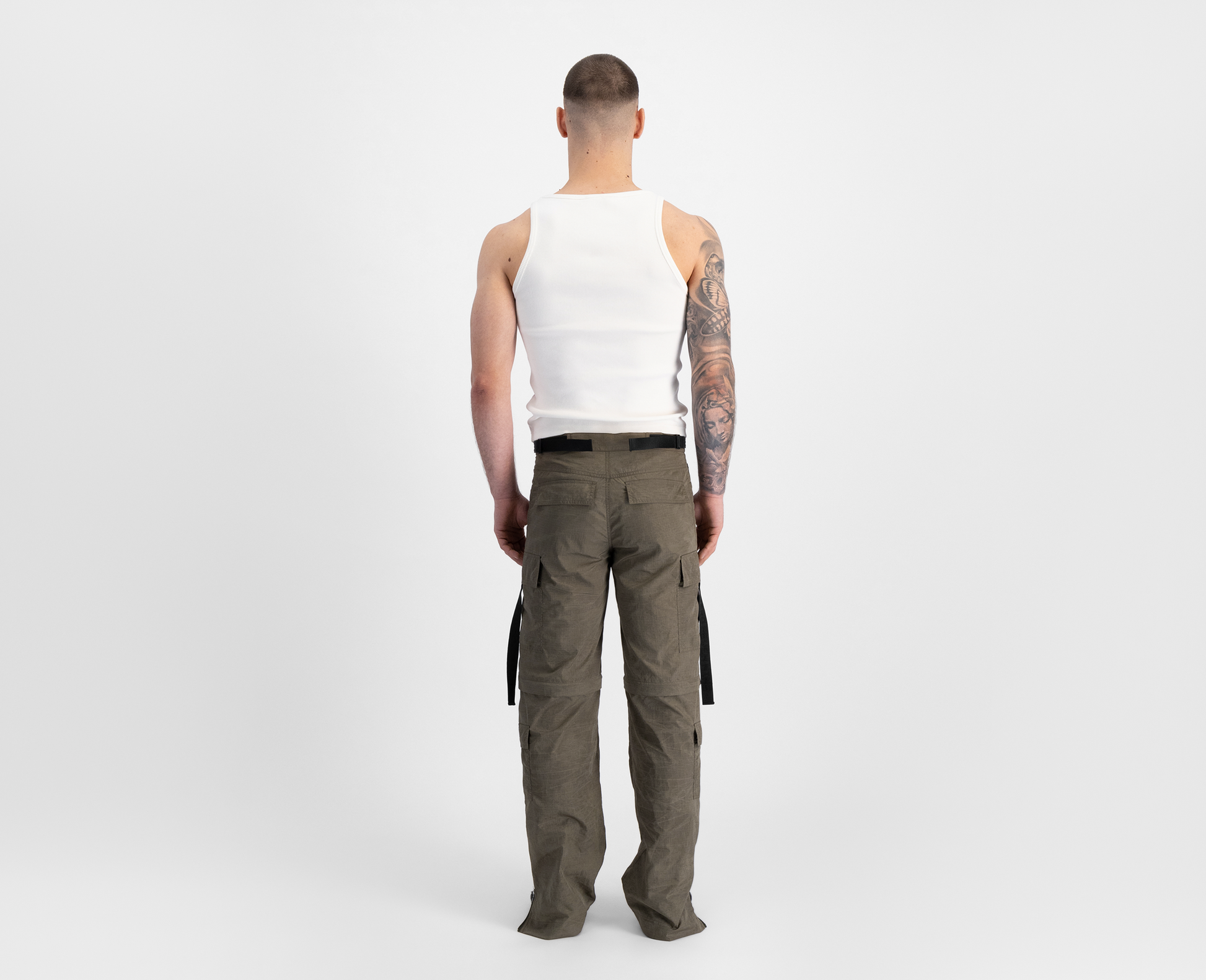 Pantalon cargo avec taille ajustable, jambe large et fermetures éclair aux genoux pour une option short. Fabriqué en Suisse.