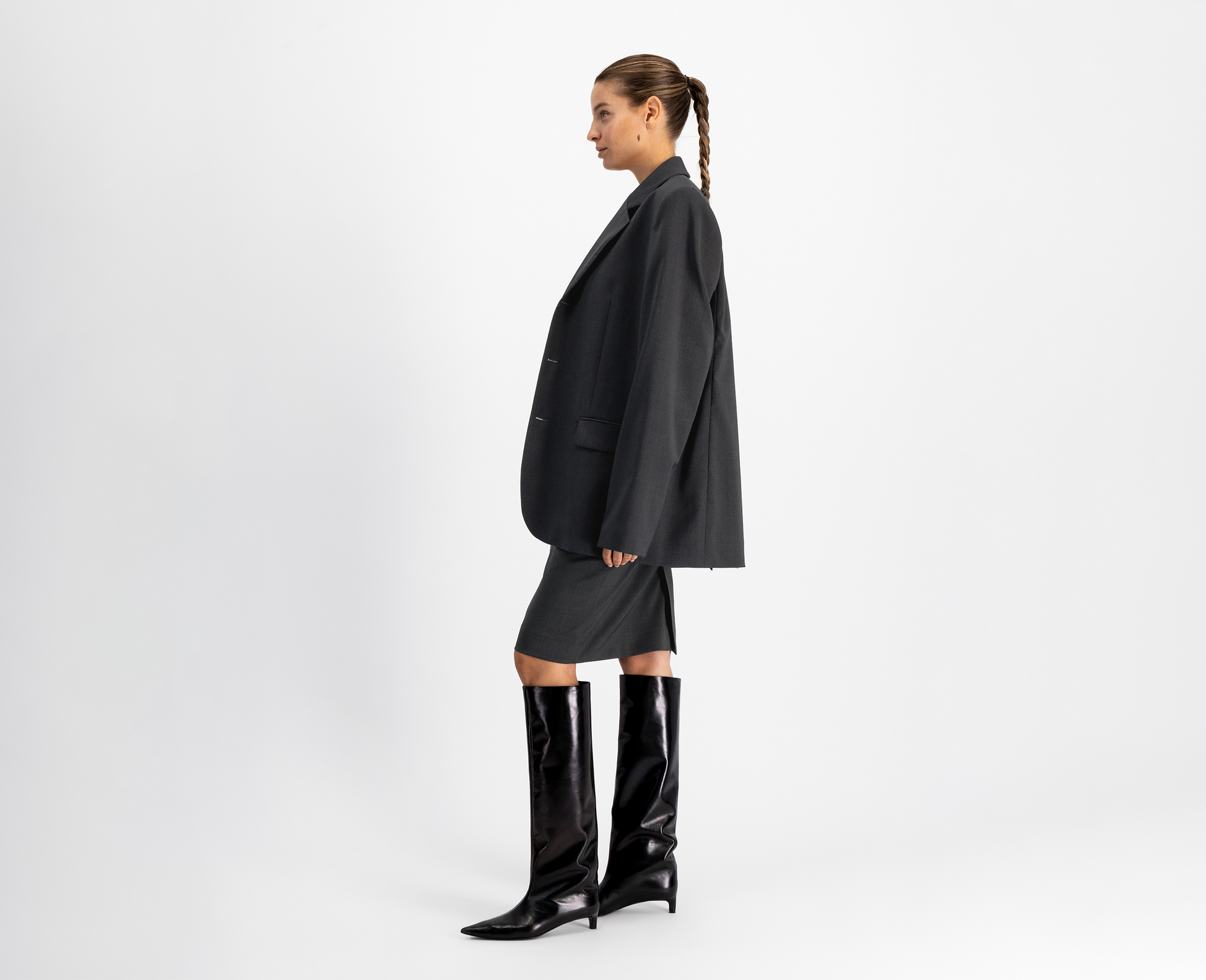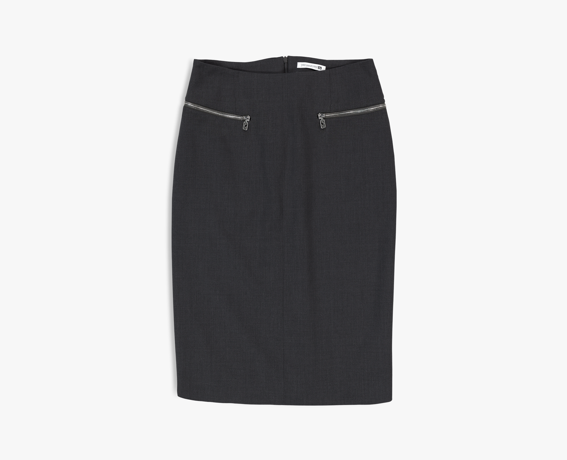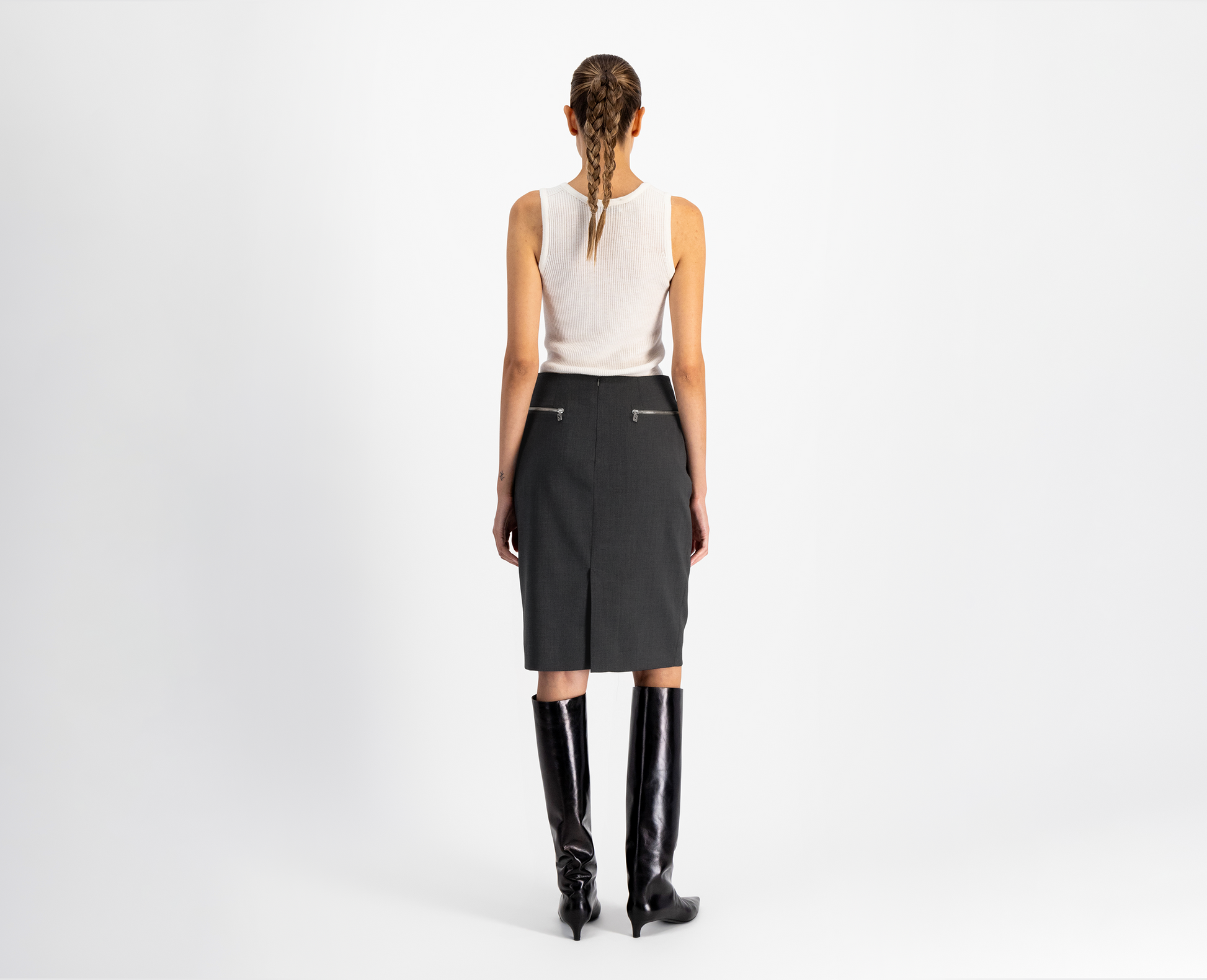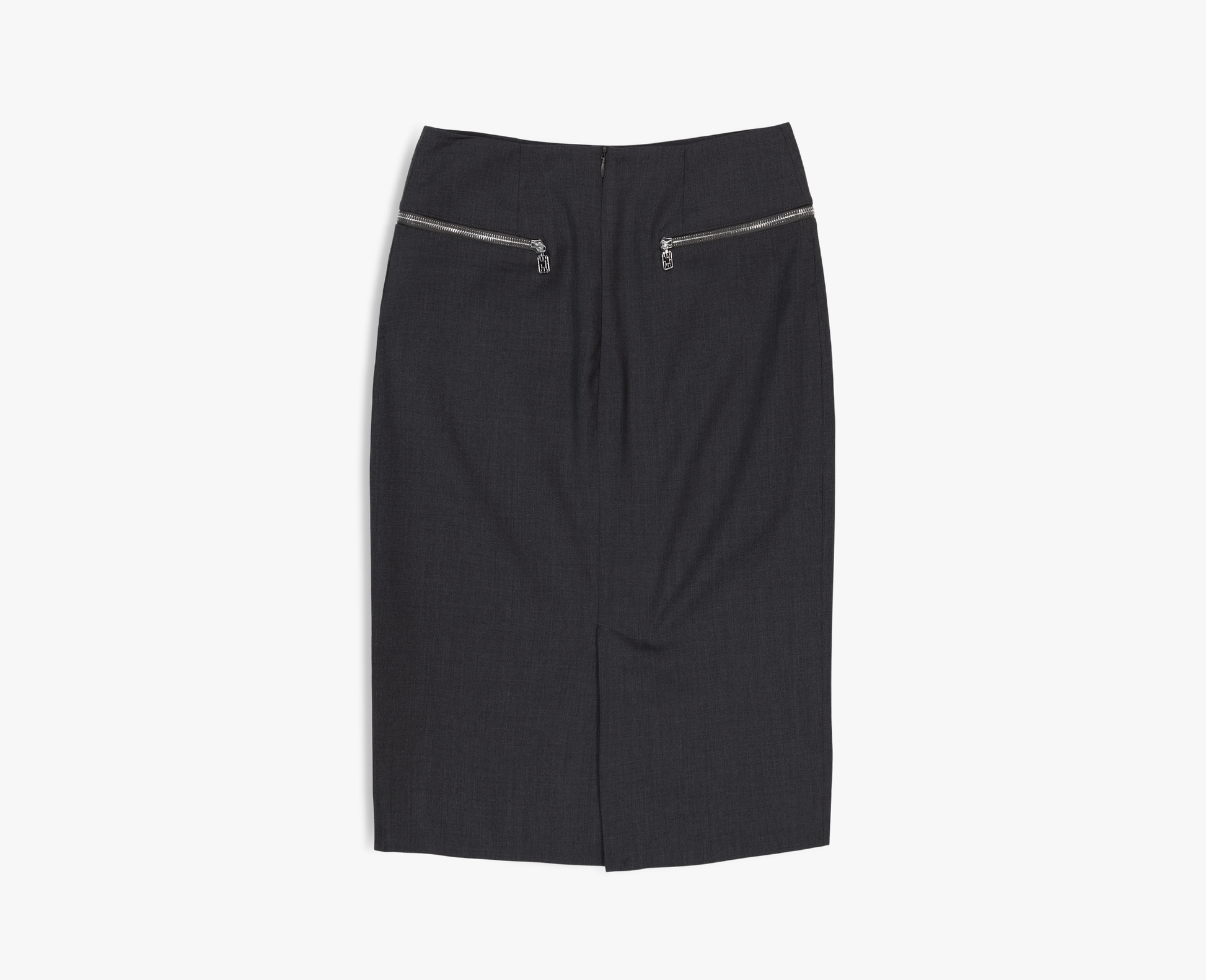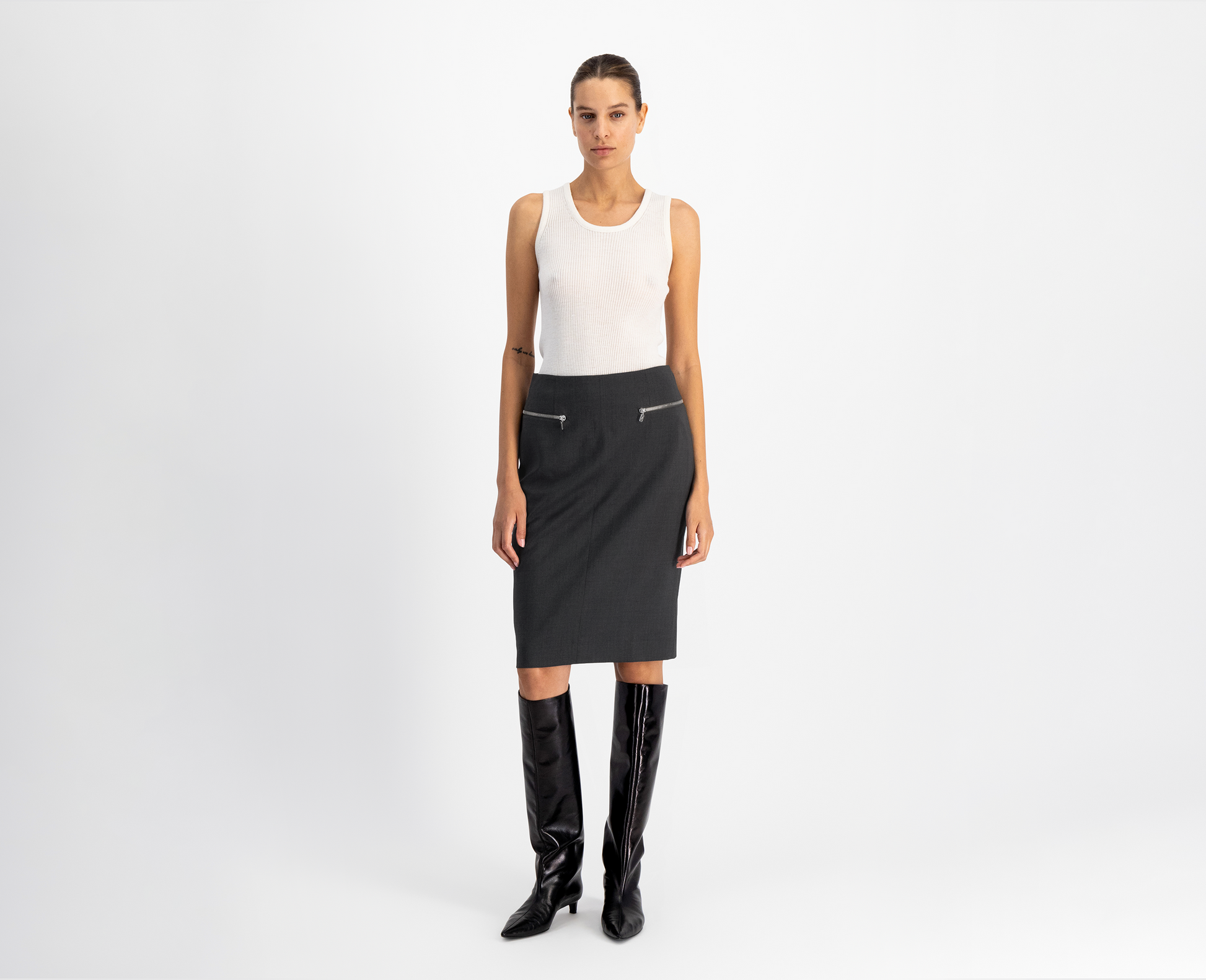 Bleistiftrock aus 100% Wolle, Seitentaschen mit riri Reissverschlüssen. Hergestellt in der Schweiz.