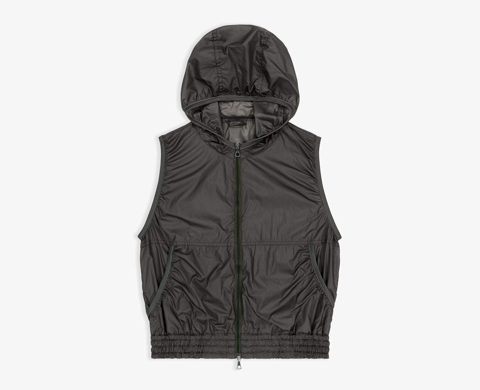Leichte Cargoweste aus Nylon, verkürzt geschnitten mit elastischem Bund und Kapuze. Hergestellt in der Schweiz.