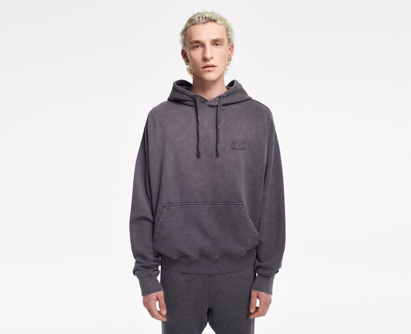 Kapuzenpullover cropped aus Bio-Baumwolle, unisex mit überschnittenen Schultern und aufgesetzter Kängurutasche.