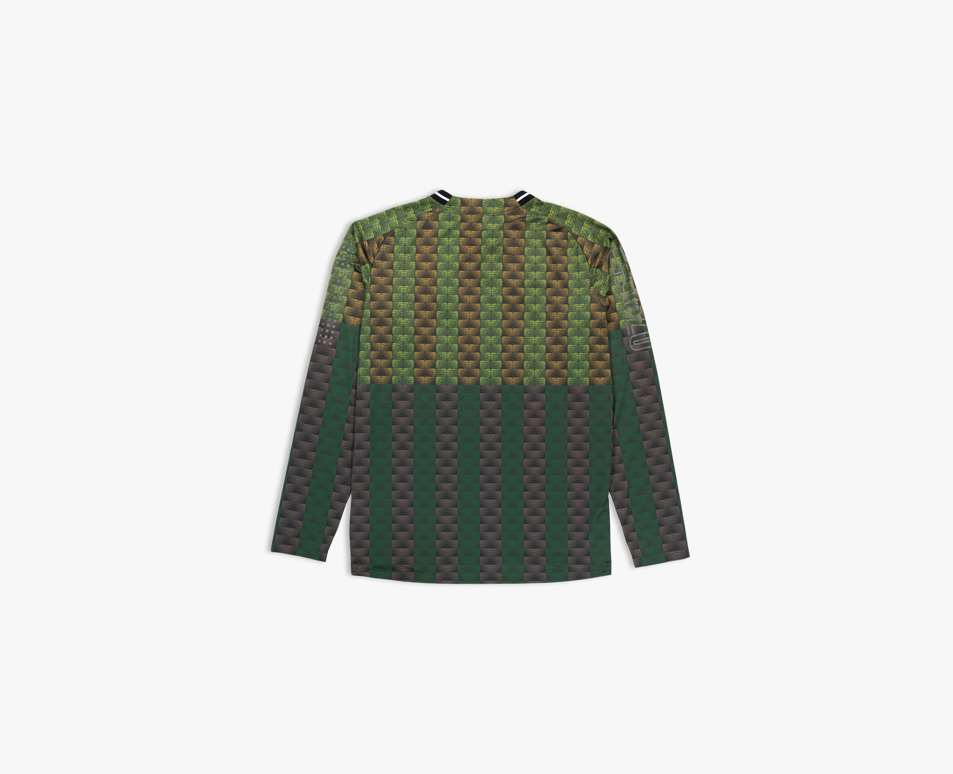 Langarm-Soccer Shirt aus elastischem Polyester-Jersey mit Allover-Print, Logo auf der Brust und verschiedenen Badges. Normale Unisex-Passform mit Rundhals und Raglanärmeln.