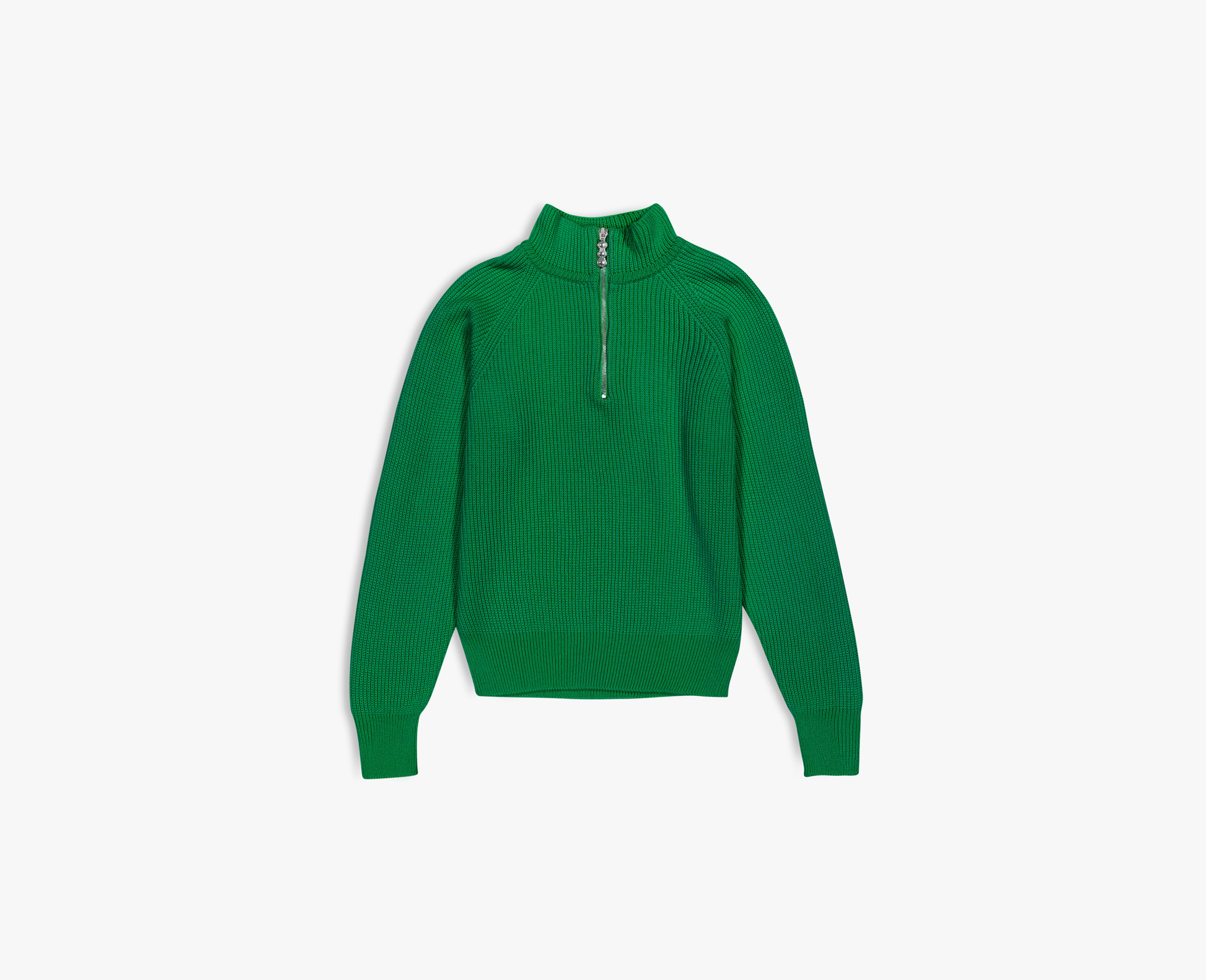 Pullover aus reiner Merionwolle mit hohem Kragen und riri-Reissverschluss. Hergestellt in der Schweiz.