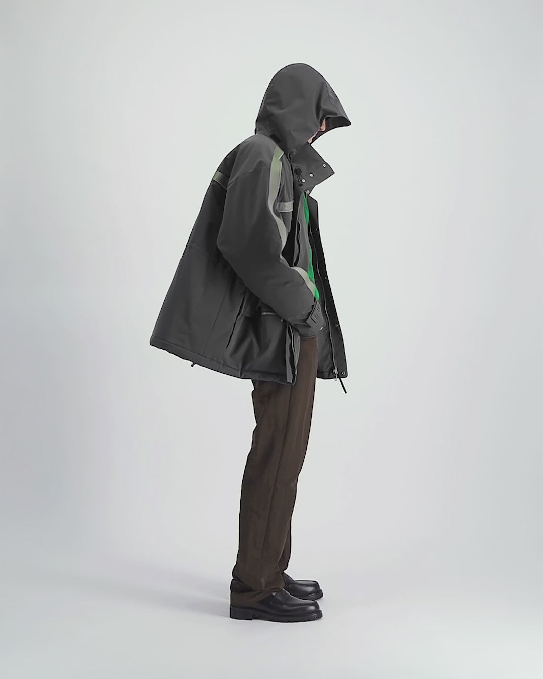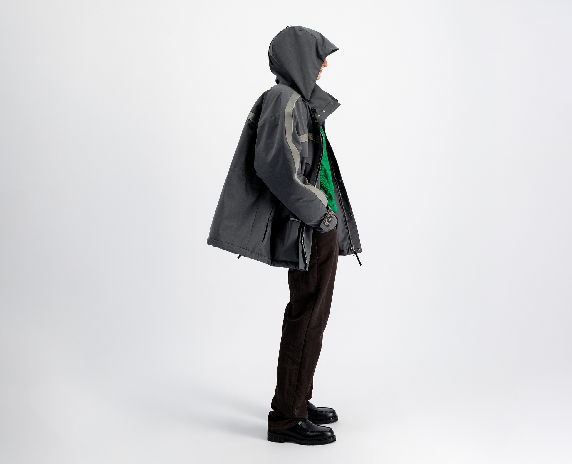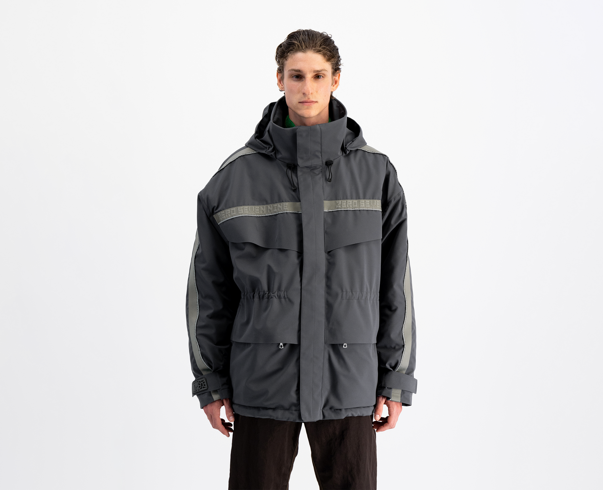 Parka im oversized Stil, unisex, hohem Kragen, grossen Taschen und reflektierenden Details. Hergestellt in der Schweiz.