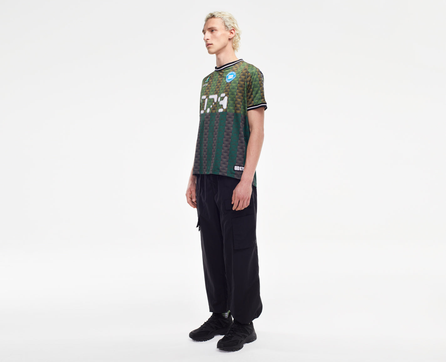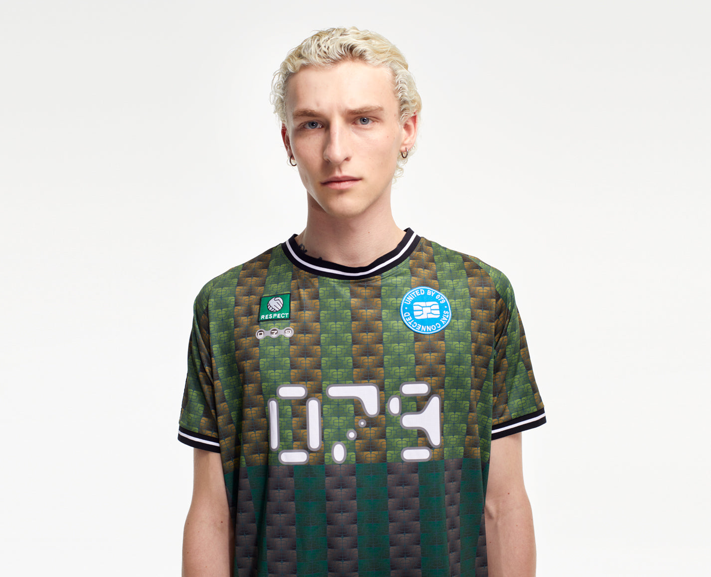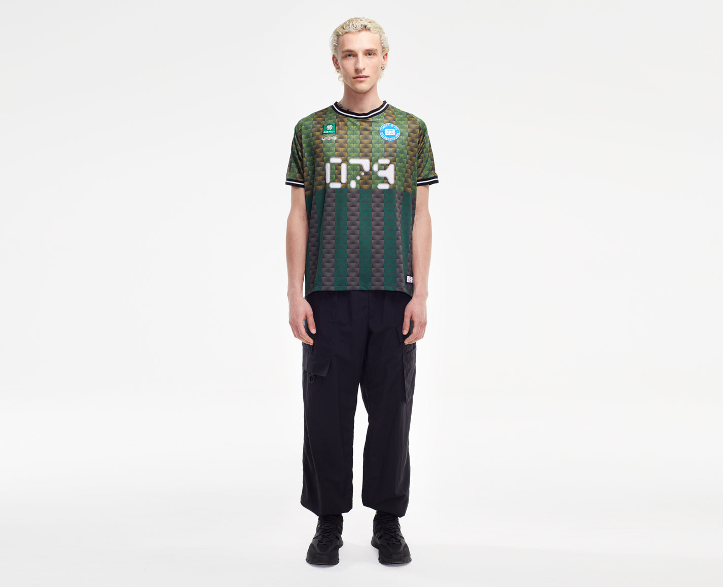 Soccer Shirt aus elastischem Polyester-Jersey mit Allover-Print, Logo auf der Brust und verschiedenen Badges. Normale Unisex-Passform mit Rundhalsausschnitt, Raglanärmeln und gestreiften Ärmelbündchen.
