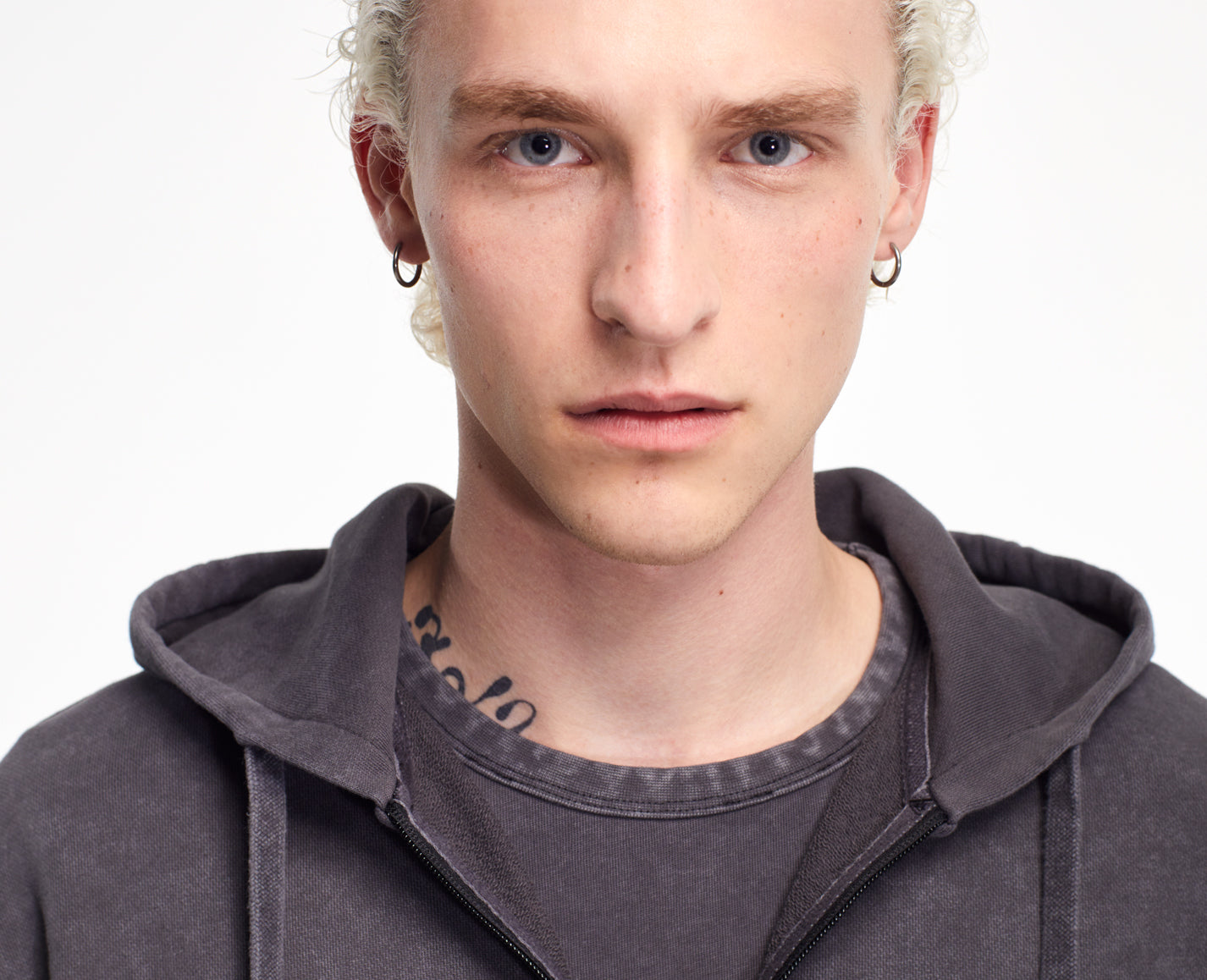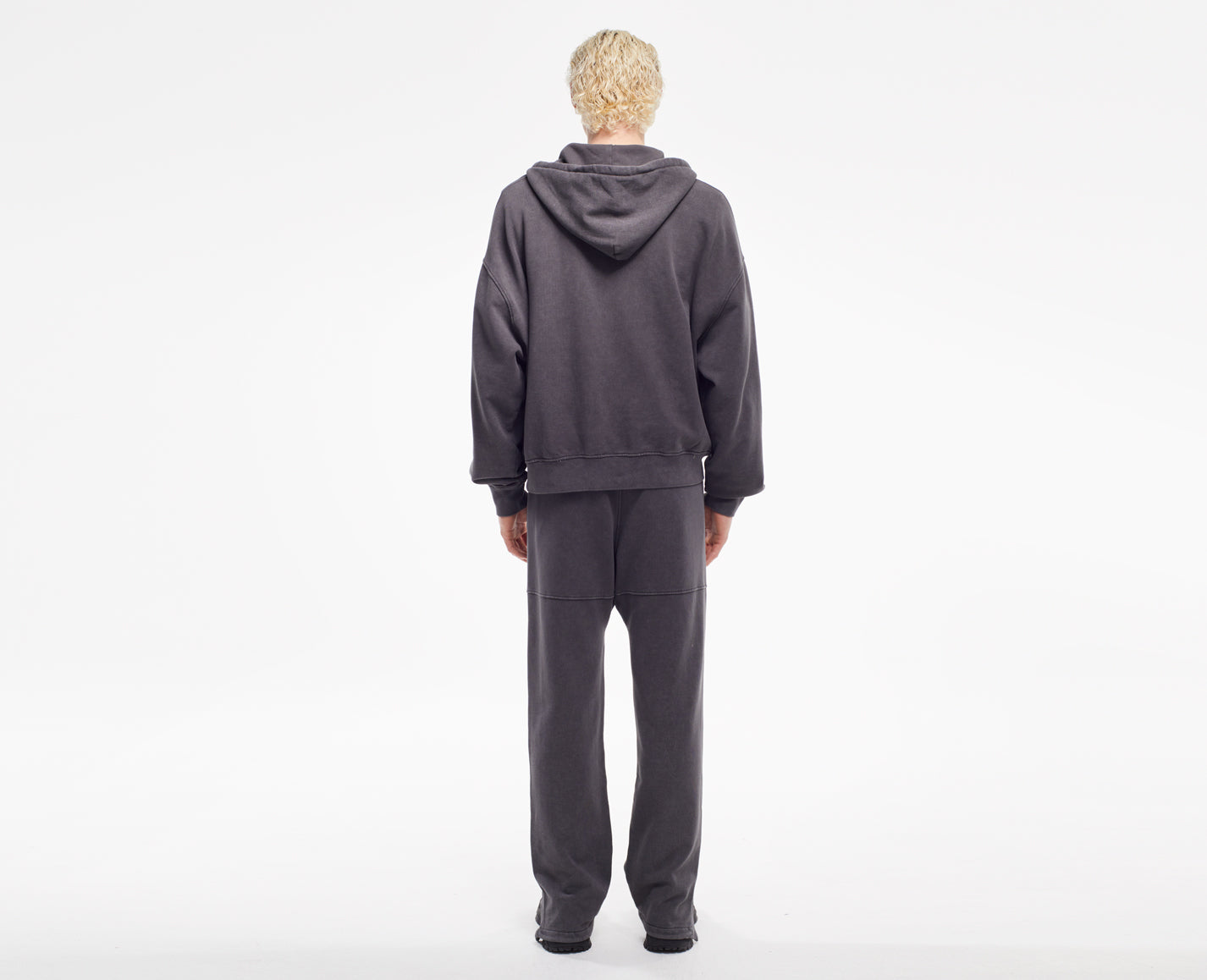 Zip-Hoodie-Jacke unisex aus Bio-Baumwolle mit überschnittenen Schultern und aufgesetzter Kängurutasche.
