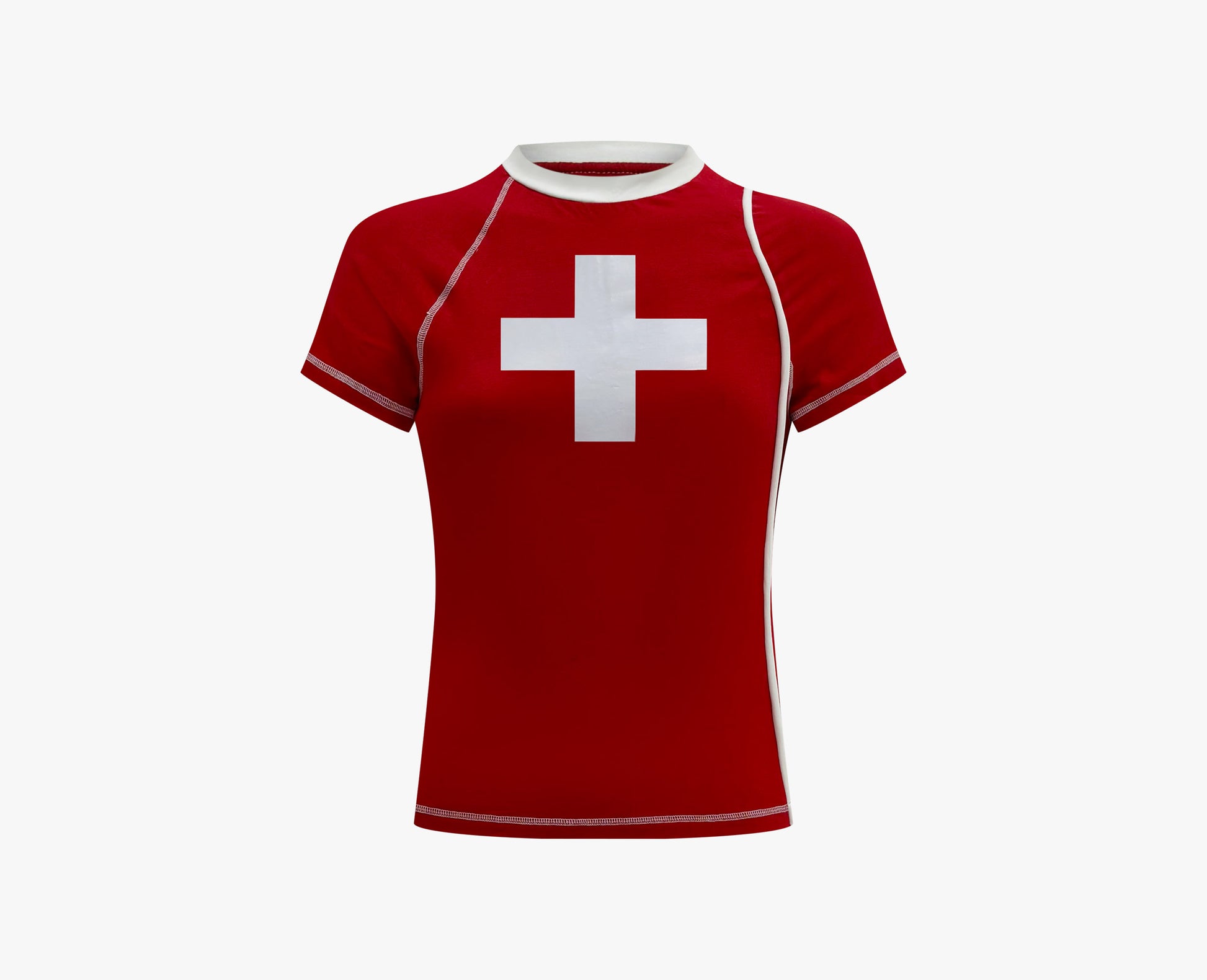 Bio- Baumwoll T-Shirt mit Schweizer Flagge. Detail mit skulpturell geformtem Träger. Ottolinger x 079 Logo Print im Nacken.
