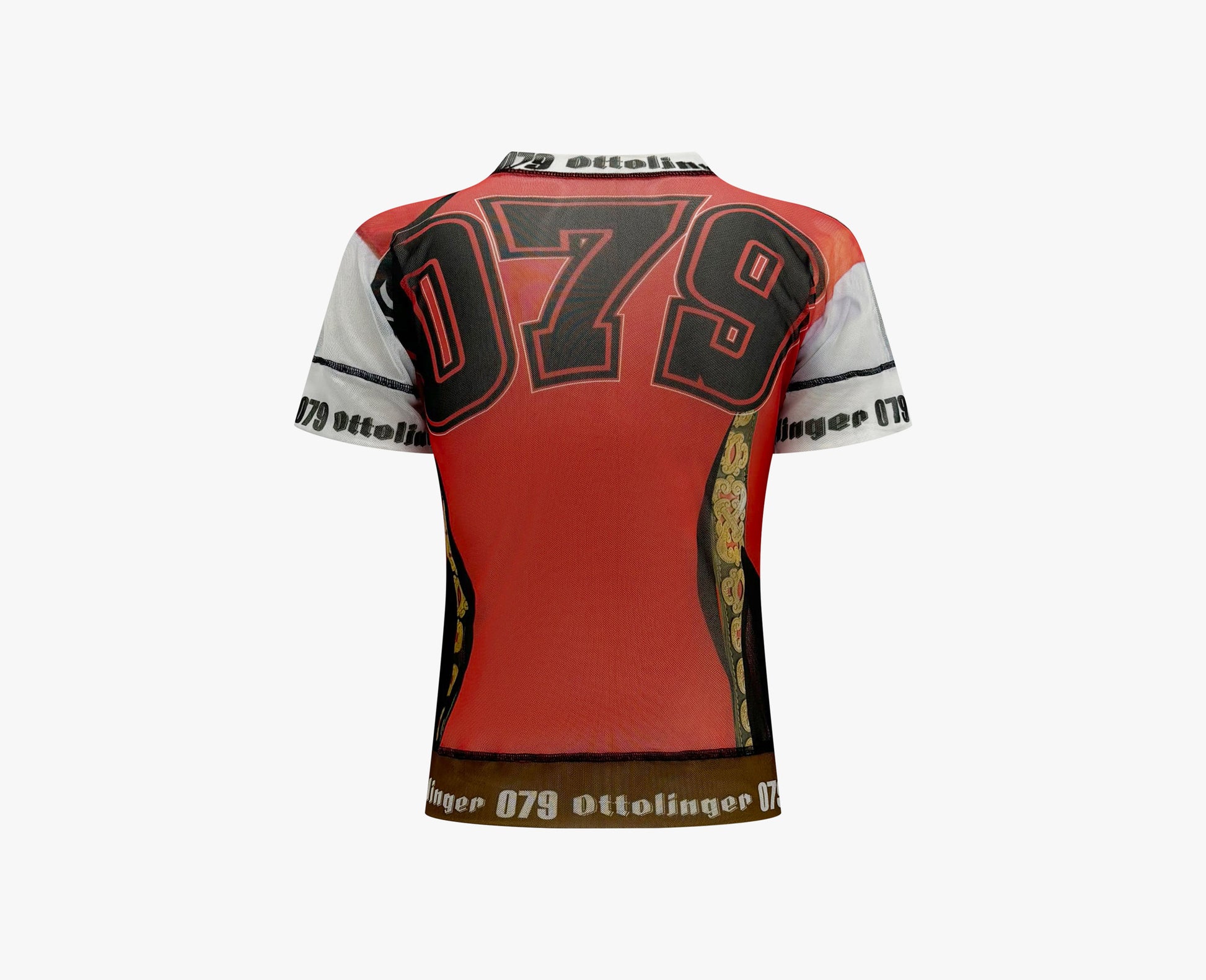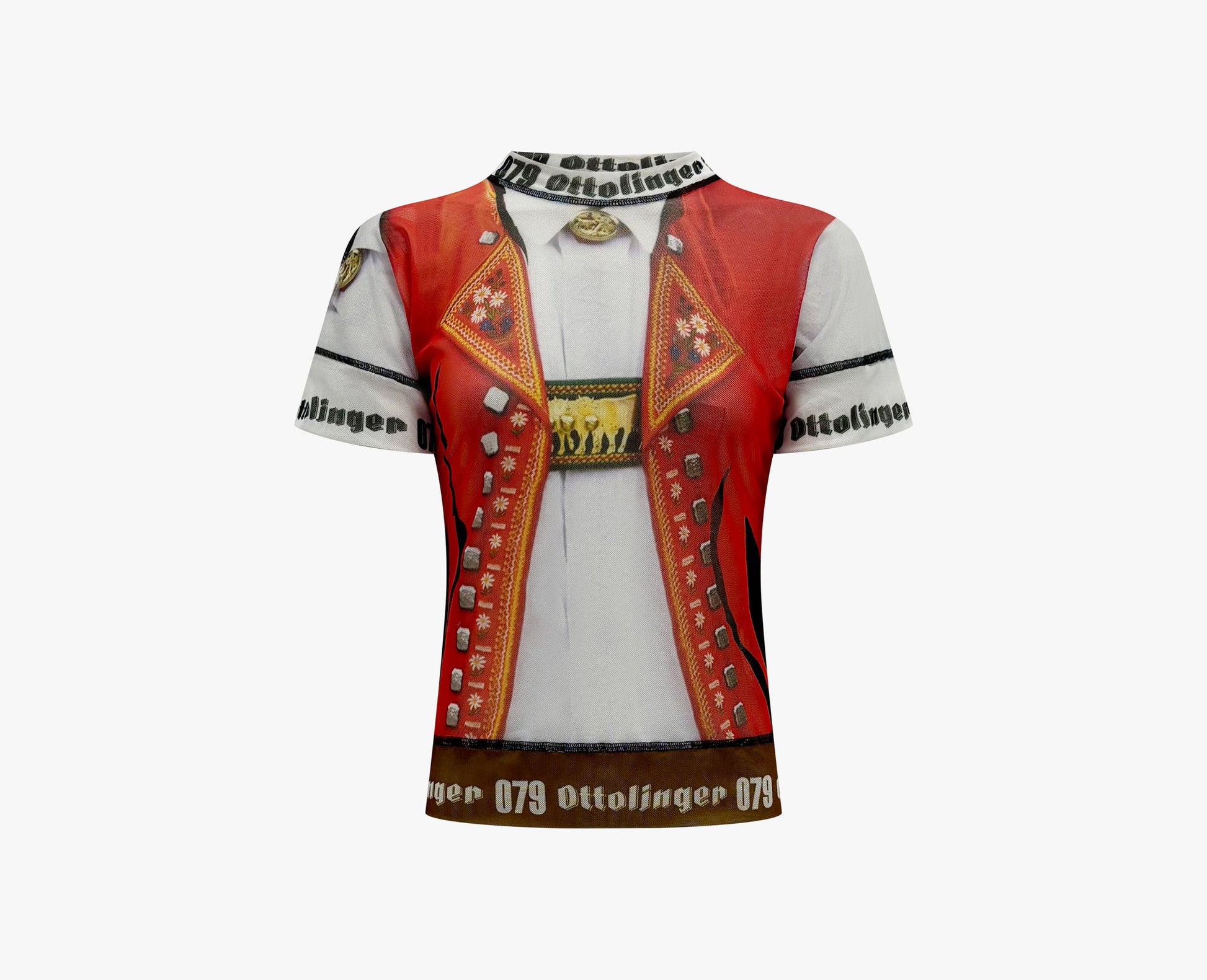 Mesh T-Shirt mit Appenzeller Männertracht Print auf recyceltem Stretch-Mesh. Signatur Ottolinger & 079-Logos sind auf dem Kragen, den Manschetten und dem Saum des Shirts gedruckt.