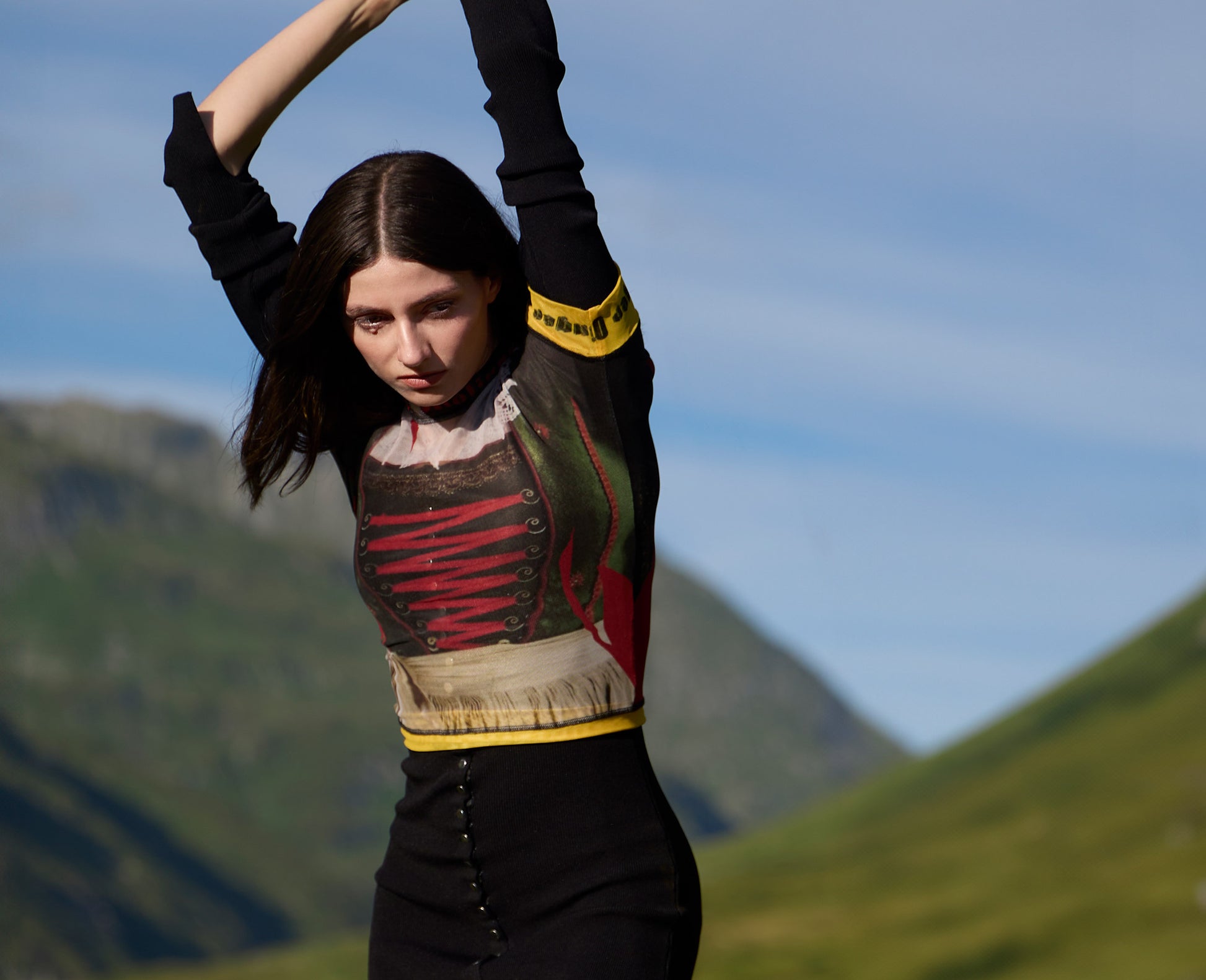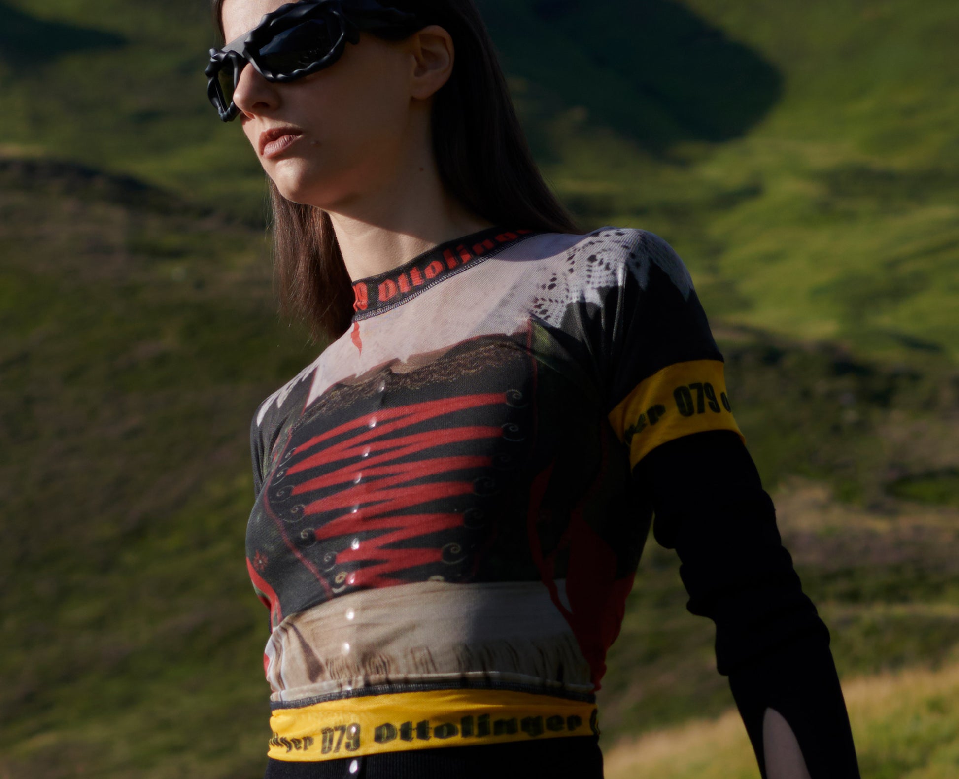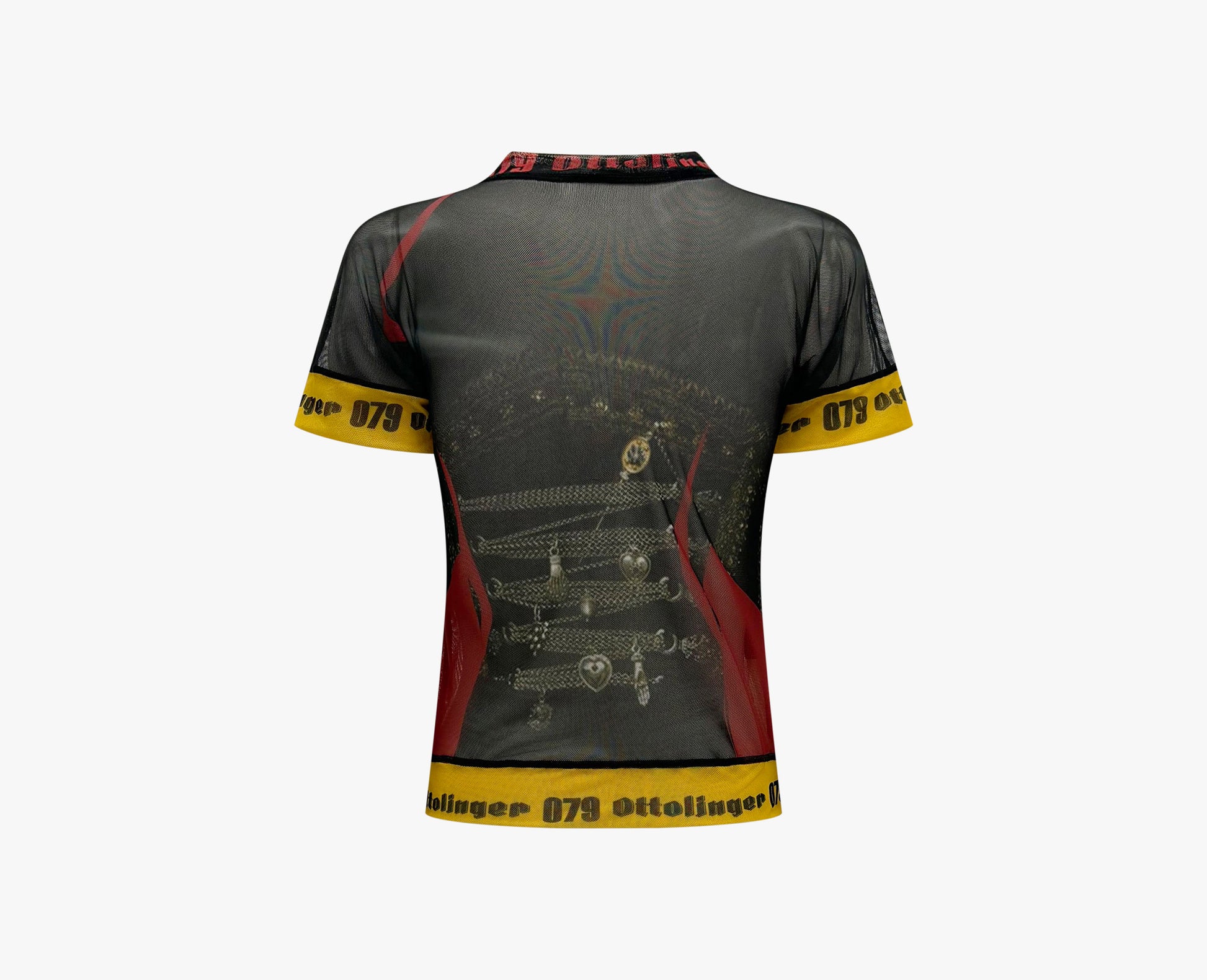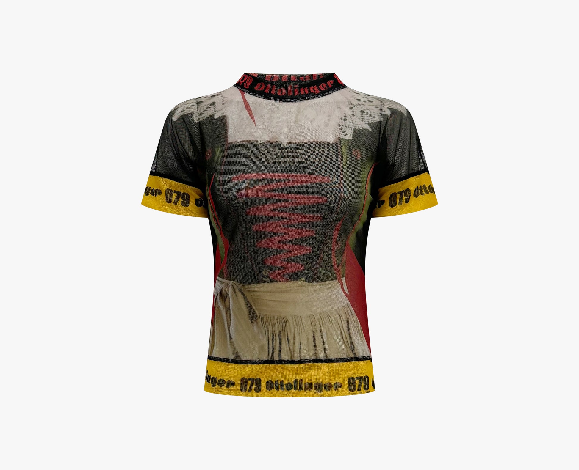 Mesh T-Shirt mit Appenzeller Frauentracht Print auf recyceltem Stretch-Mesh. Signatur Ottolinger & 079-Logos sind auf dem Kragen, den Manschetten und dem Saum des Shirts gedruckt.